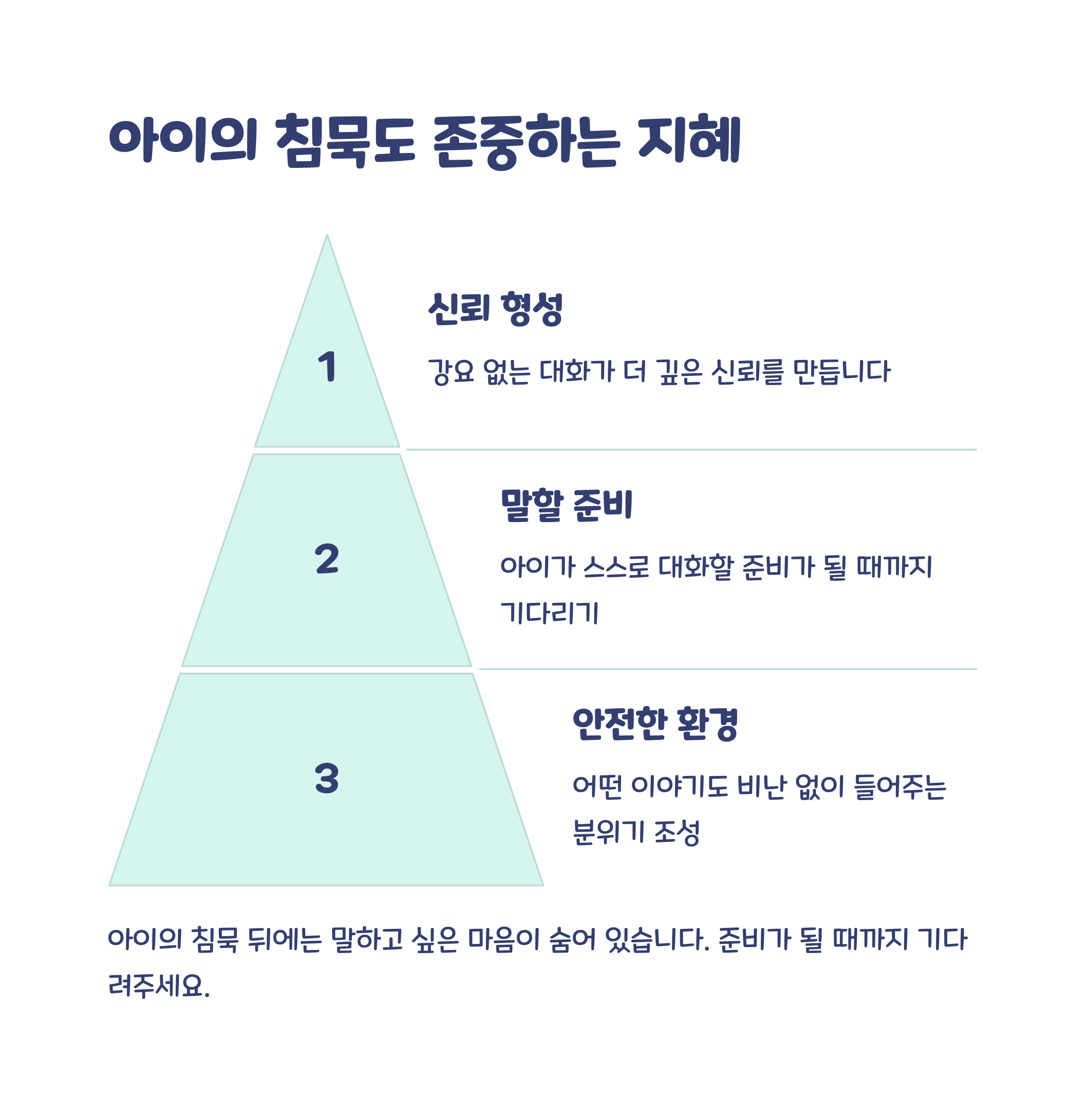일단 아이의 기분을 인정하고 기다려 주세요. “말하고 싶지 않구나”라며 존중하면 오히려 아이가 마음을 열고 나중에 먼저 다가올 수 있습니다.