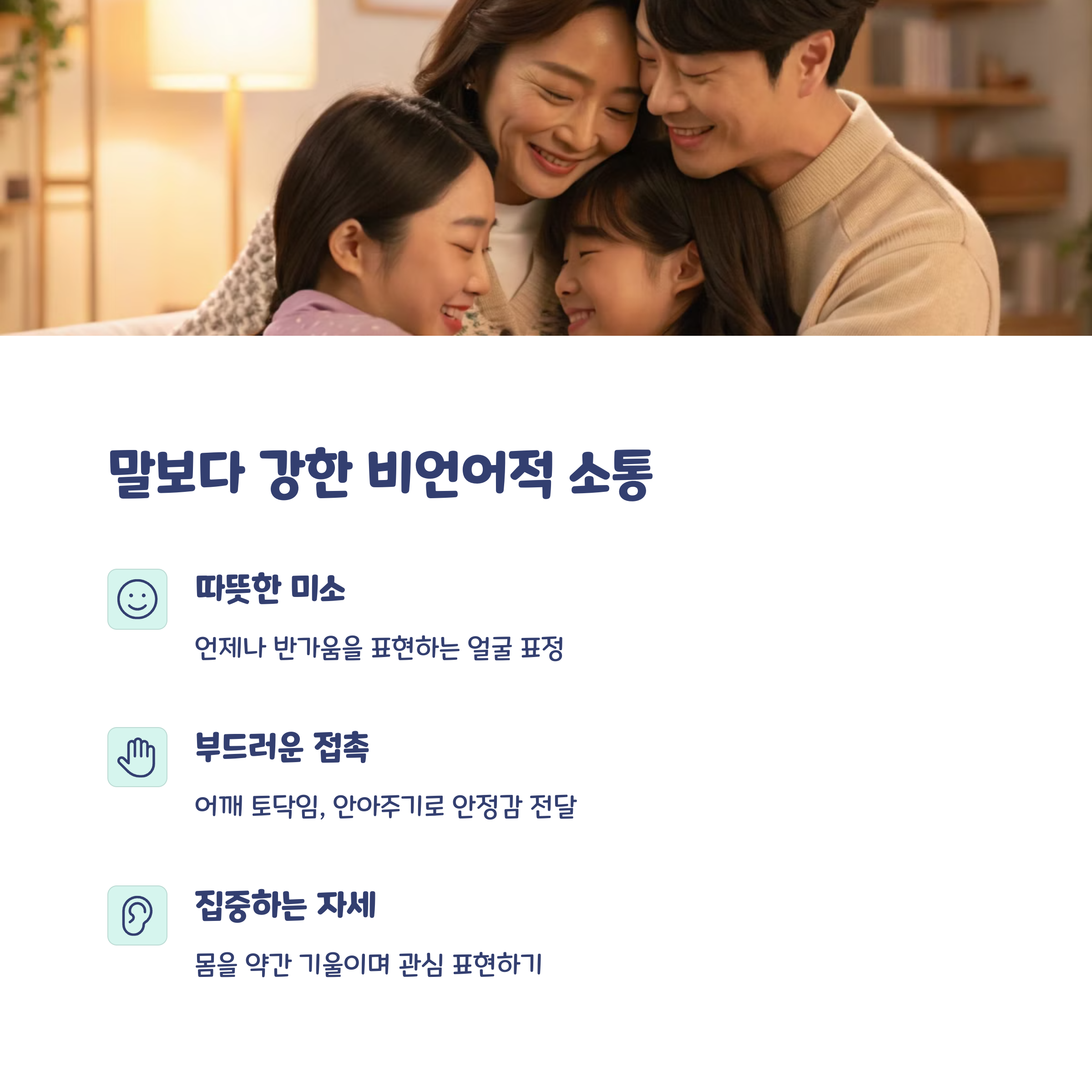 추억 공유, 감정 질문이 대화 연결에 효과적 | 반복되면 아이들도 스스로 말 걸 준비를 하게 됨 | 말의 양보다 질, 무엇보다 ‘태도’가 대화의 핵심입니다 |