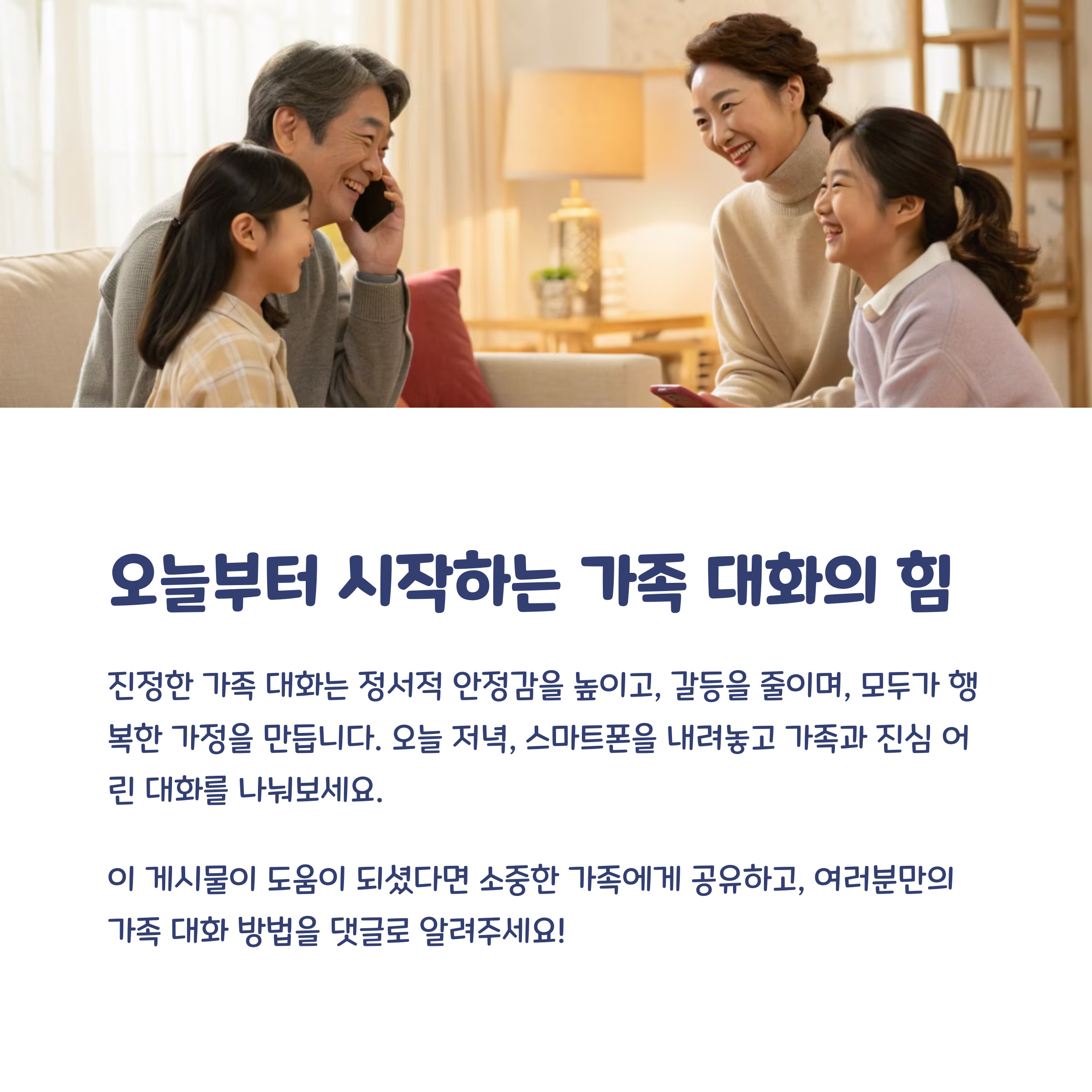 가족 간 대화를 늘리기 위해 실천하고 있는 팁이나 자주 나누는 대화 주제가 있다면 댓글로 공유해주세요. 서로에게 큰 도움이 됩니다.