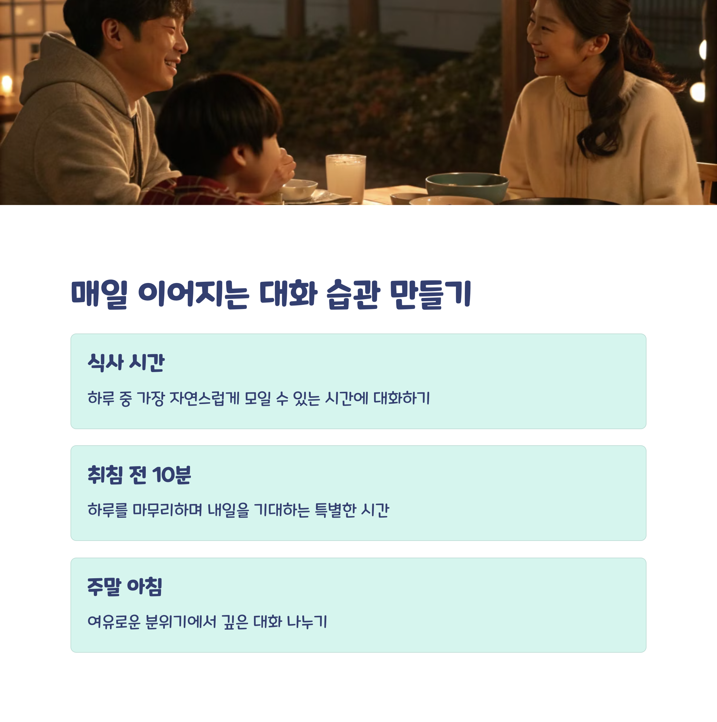두 번째는 ‘루틴 만들기’입니다. 하루 한 번, 예를 들어 저녁 식사 후 5분간 돌아가며 오늘 있었던 일을 이야기하는 시간을 만들어보세요. 규칙적인 시간은 대화를 자연스럽게 생활화할 수 있도록 도와줍니다.