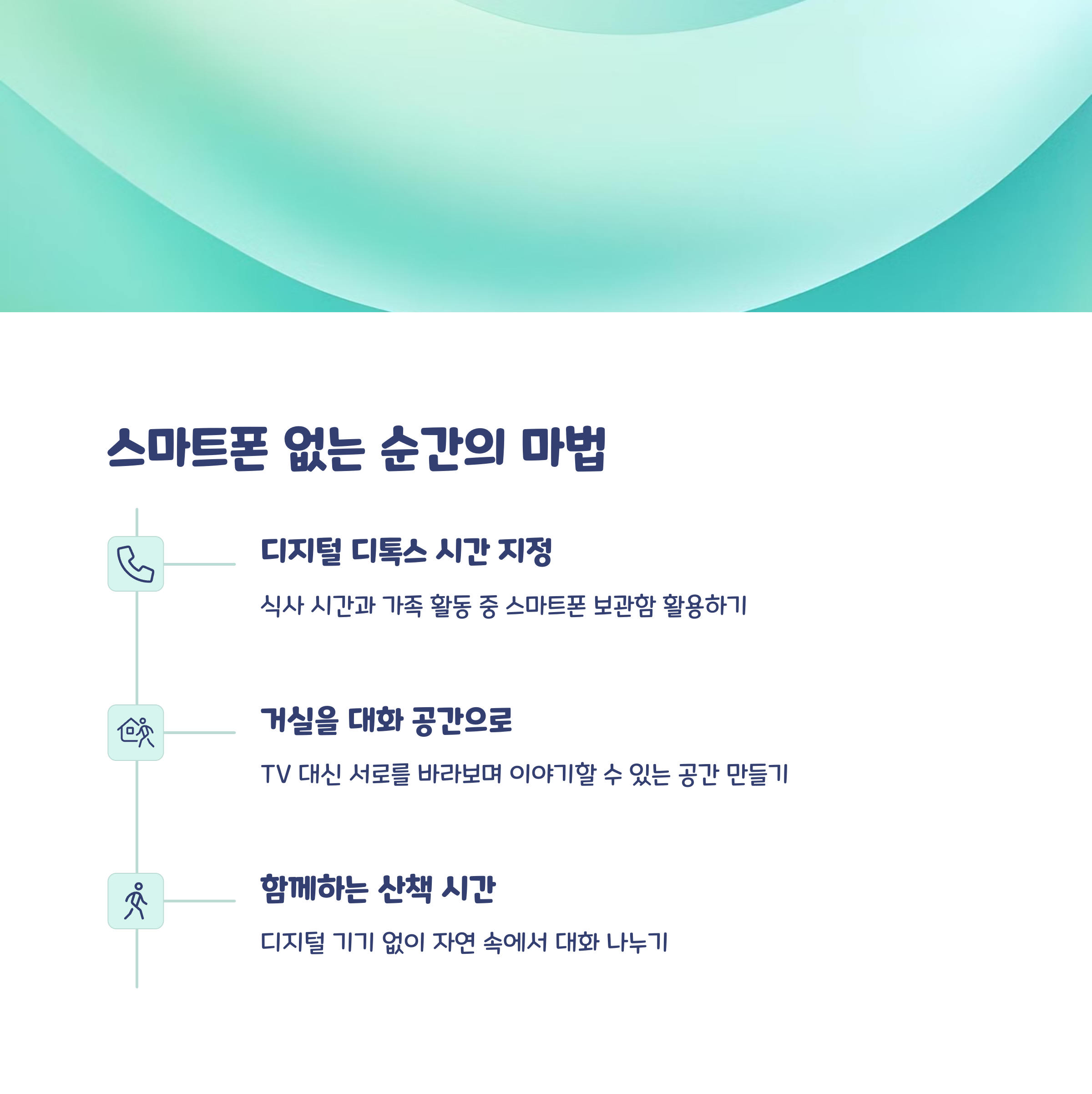 대화 부족 원인 | 스마트폰 사용, 바쁜 일정, 피로, 습관적 침묵 등으로 가족 간 대화 시간이 줄어듭니다. |