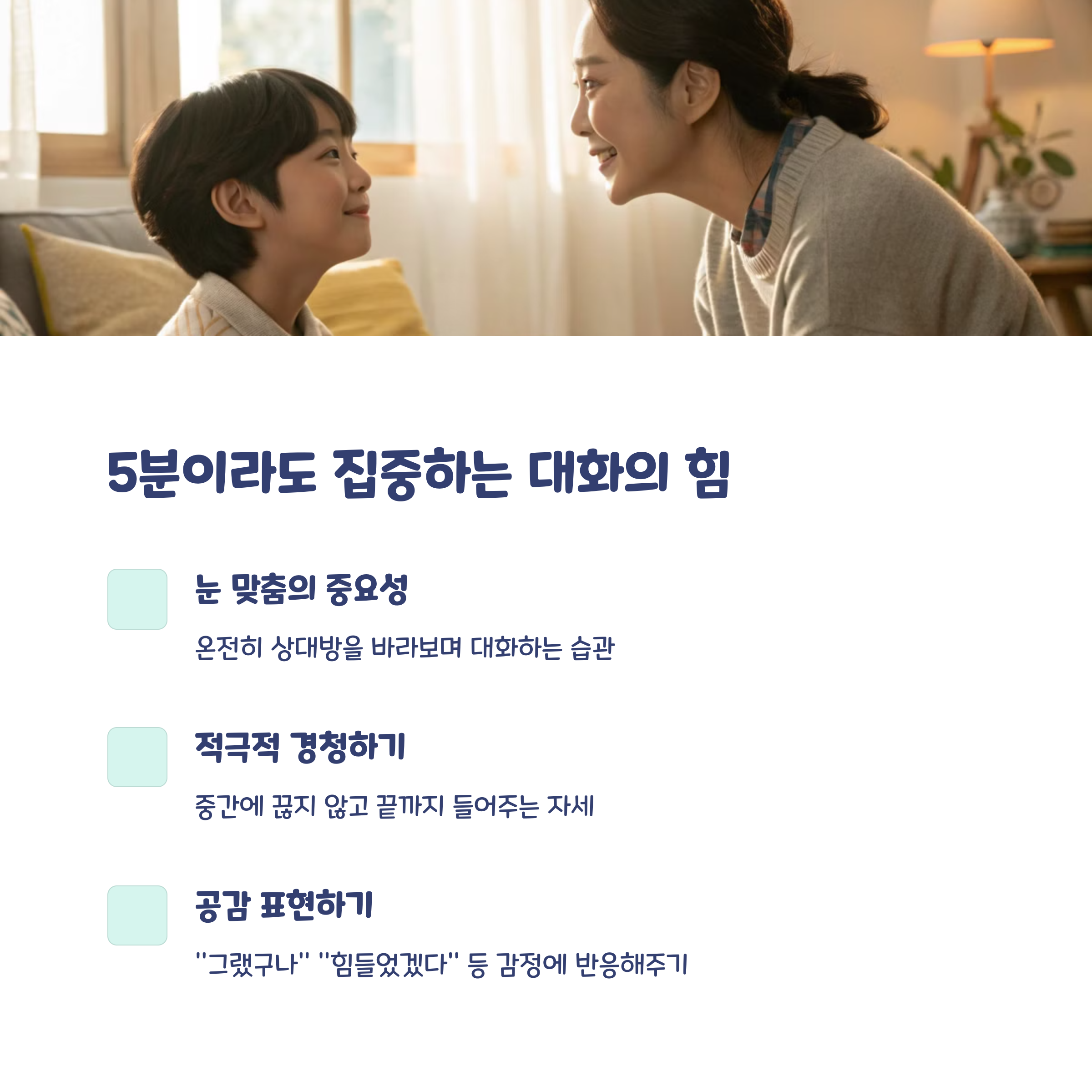 | 추억 공유, 감정 질문이 대화 연결에 효과적 | 반복되면 아이들도 스스로 말 걸 준비를 하게 됨 | 말의 양보다 질, 무엇보다 ‘태도’가 대화의 핵심입니다 |