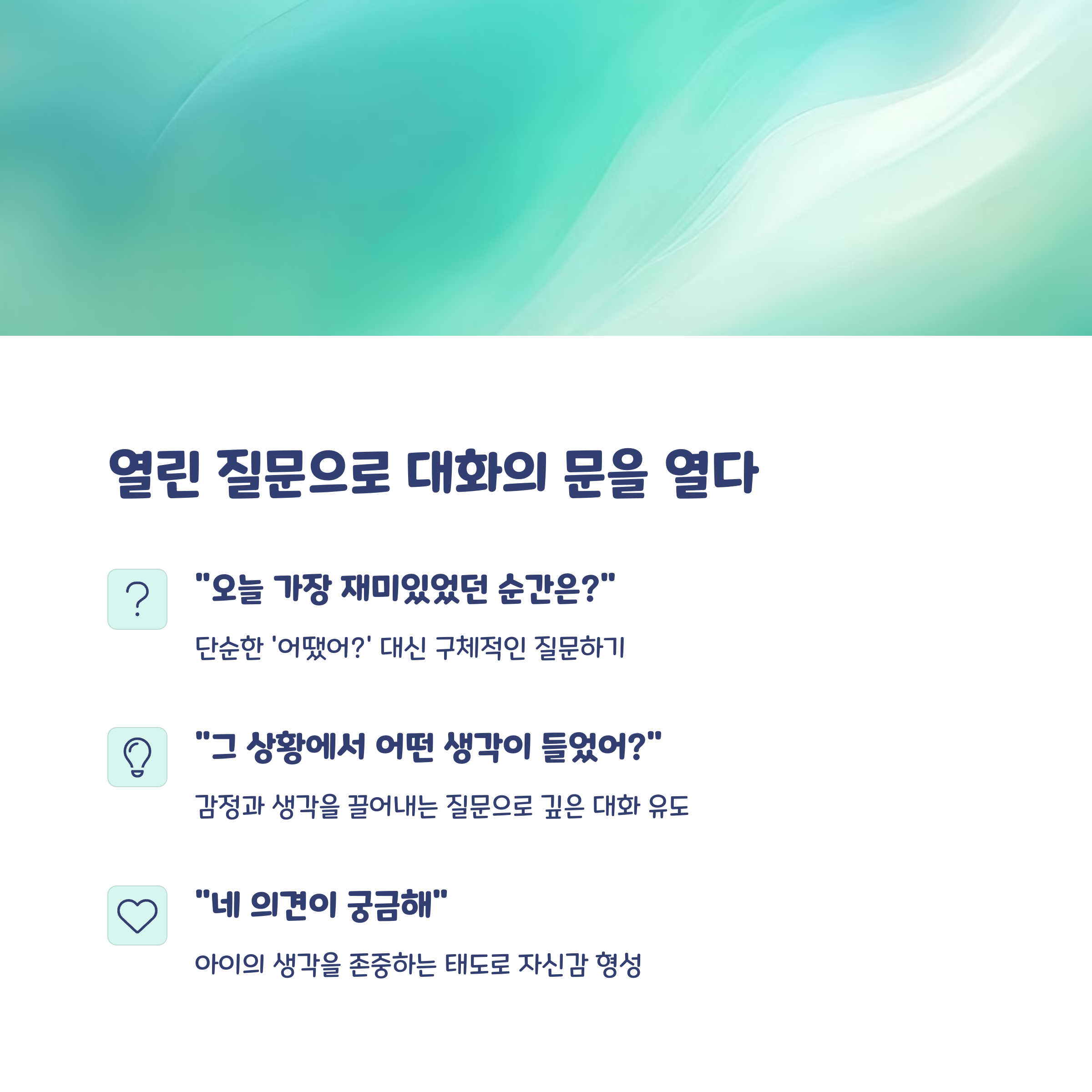 추억 공유, 감정 질문이 대화 연결에 효과적 반복되면 아이들도 스스로 말 걸 준비를 하게 됨 말의 양보다 질, 무엇보다 ‘태도’가 대화의 핵심입니다