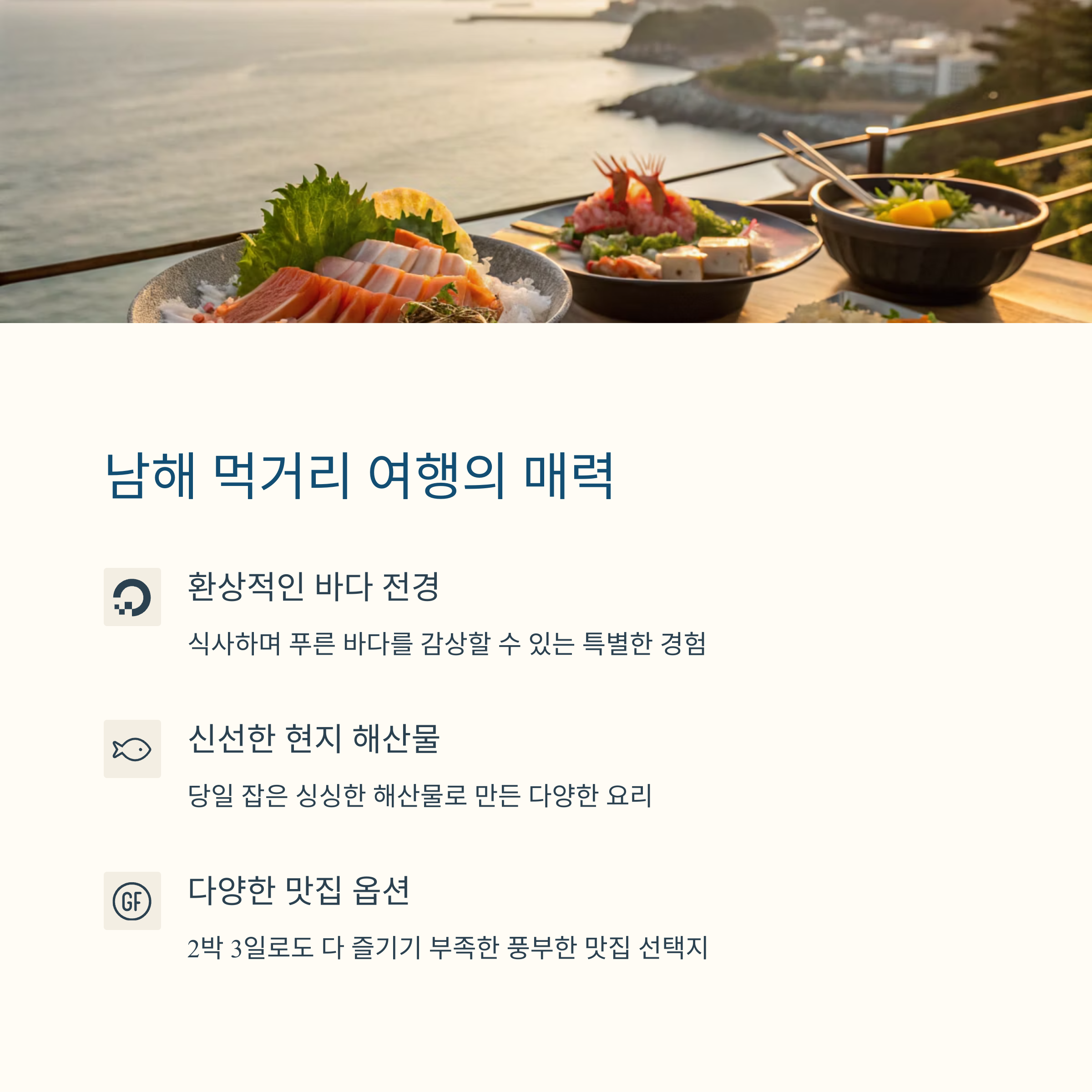 남해는 바다와 어우러진 풍경 속에서 신선한 해산물과 지역 특색 요리를 즐길 수 있는 최고의 여행지입니다.