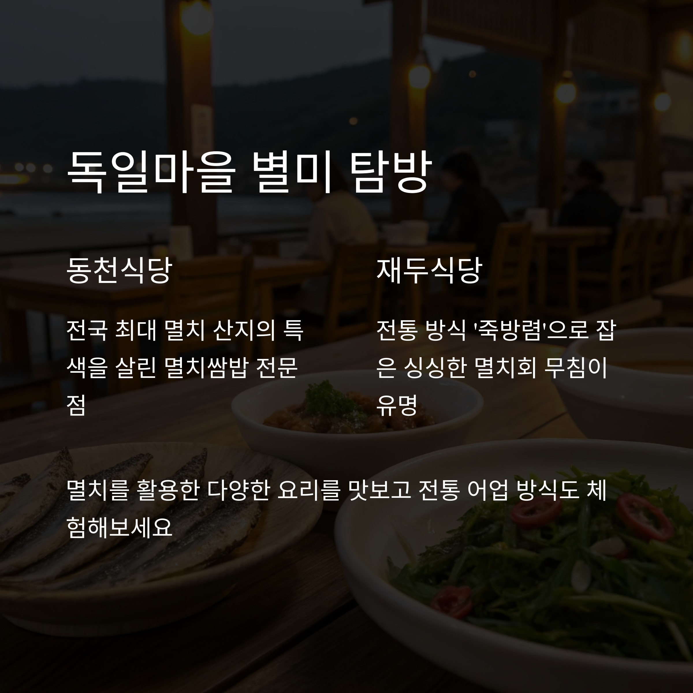 남해 독일마을 인근의 동천식당과 재두식당에서는 남해만의 특별한 멸치요리를 맛볼 수 있습니다.