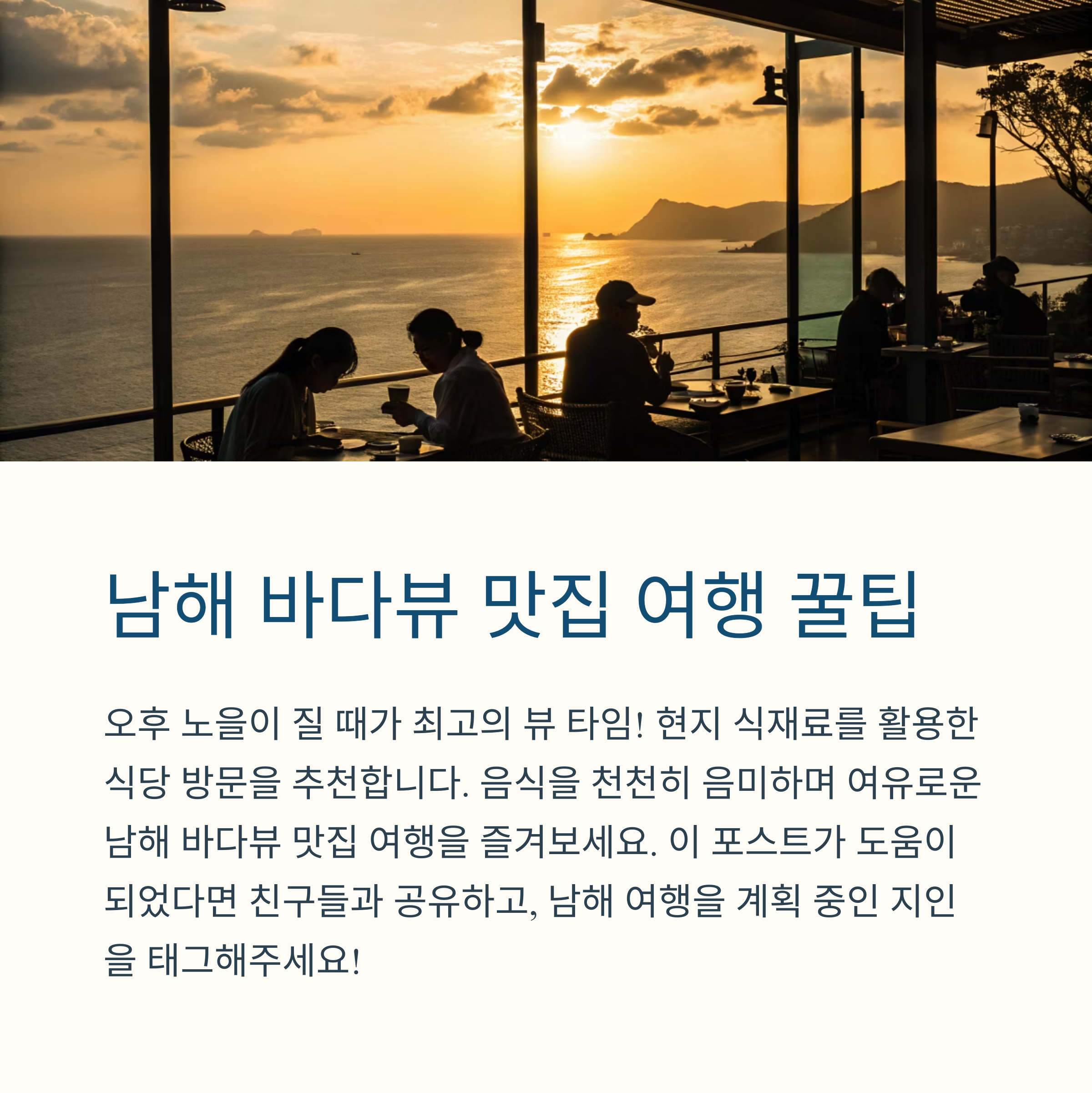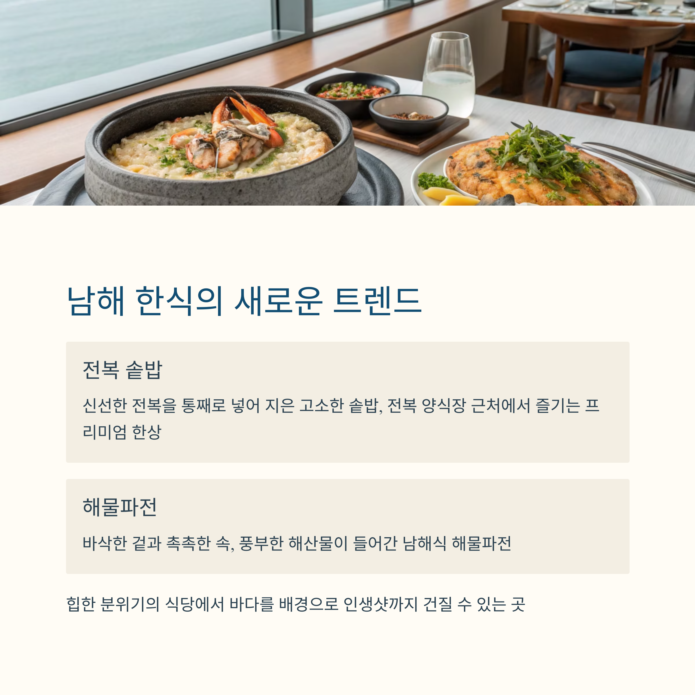 바다를 바라보며 식사를 즐기는 그 순간, 남해의 진짜 매력을 느끼게 됩니다.