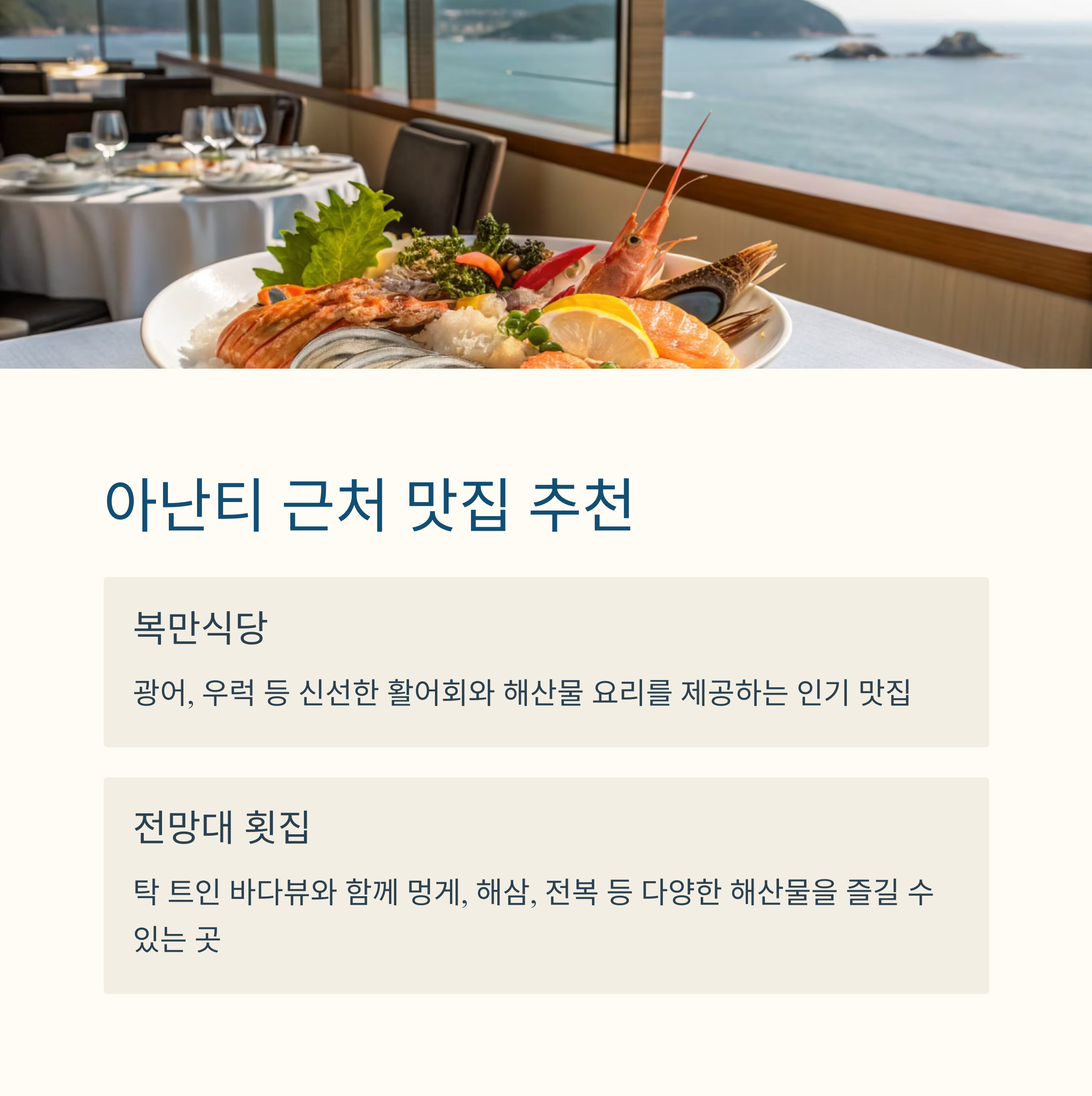 남해 아난티 주변에는 숨겨진 바다뷰 맛집이 가득합니다.