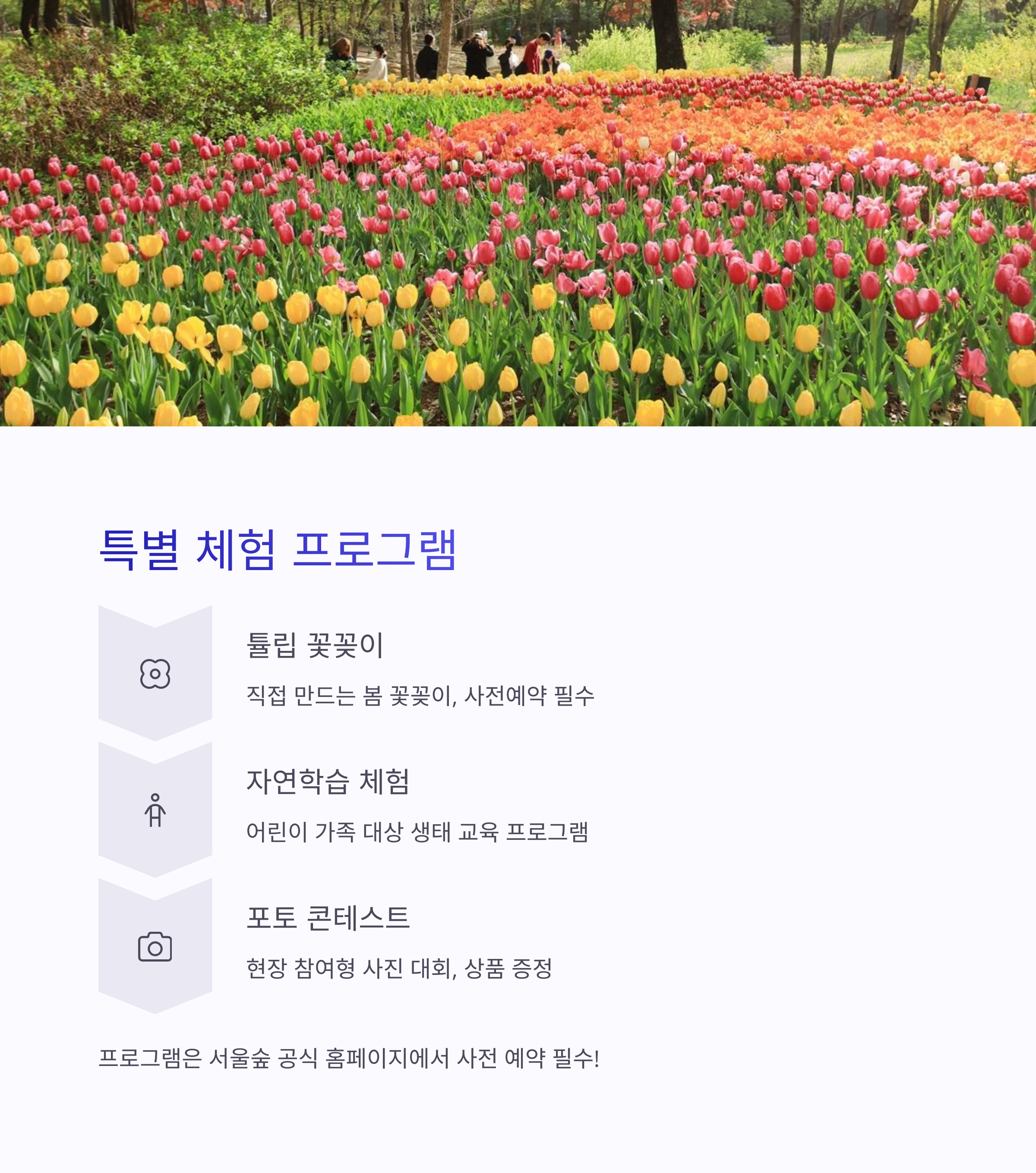 서울숲 튤립 축제 기간에는 다양한 체험 프로그램도 함께 진행됩니다.