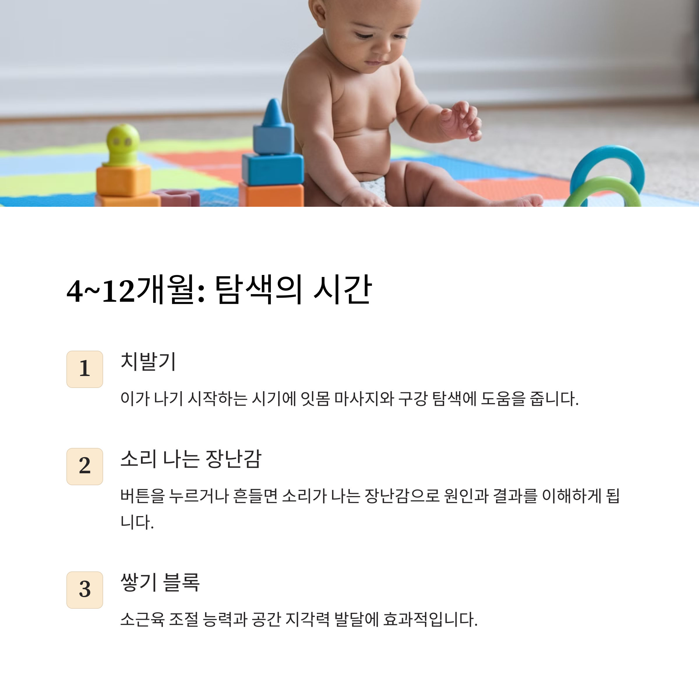| 영아 (4~12개월) | 치발기, 소리 나는 장난감, 쌓기 블록 |
