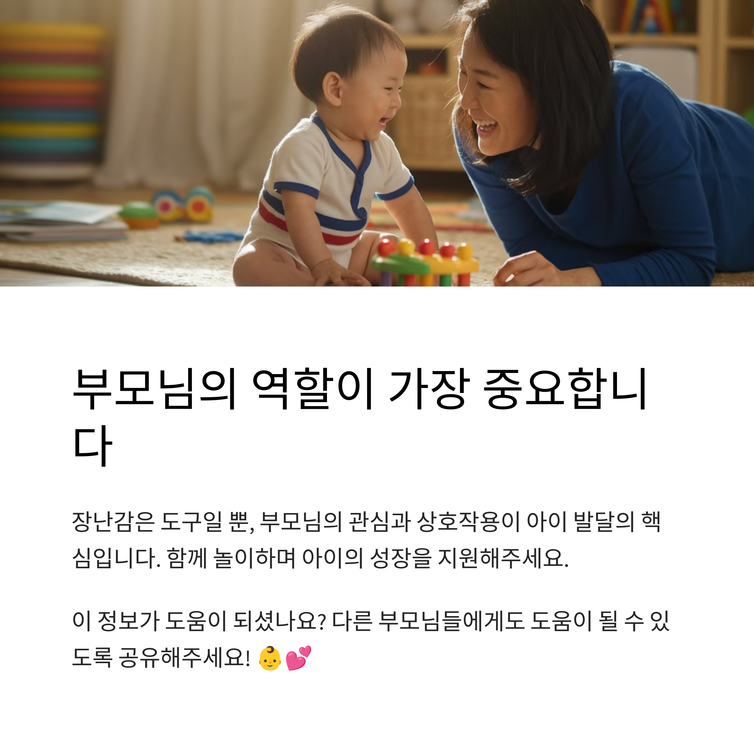 아기에게 도움이 되었던 장난감을 댓글로 공유해주세요! 부모님들의 다양한 경험이 큰 도움이 됩니다.