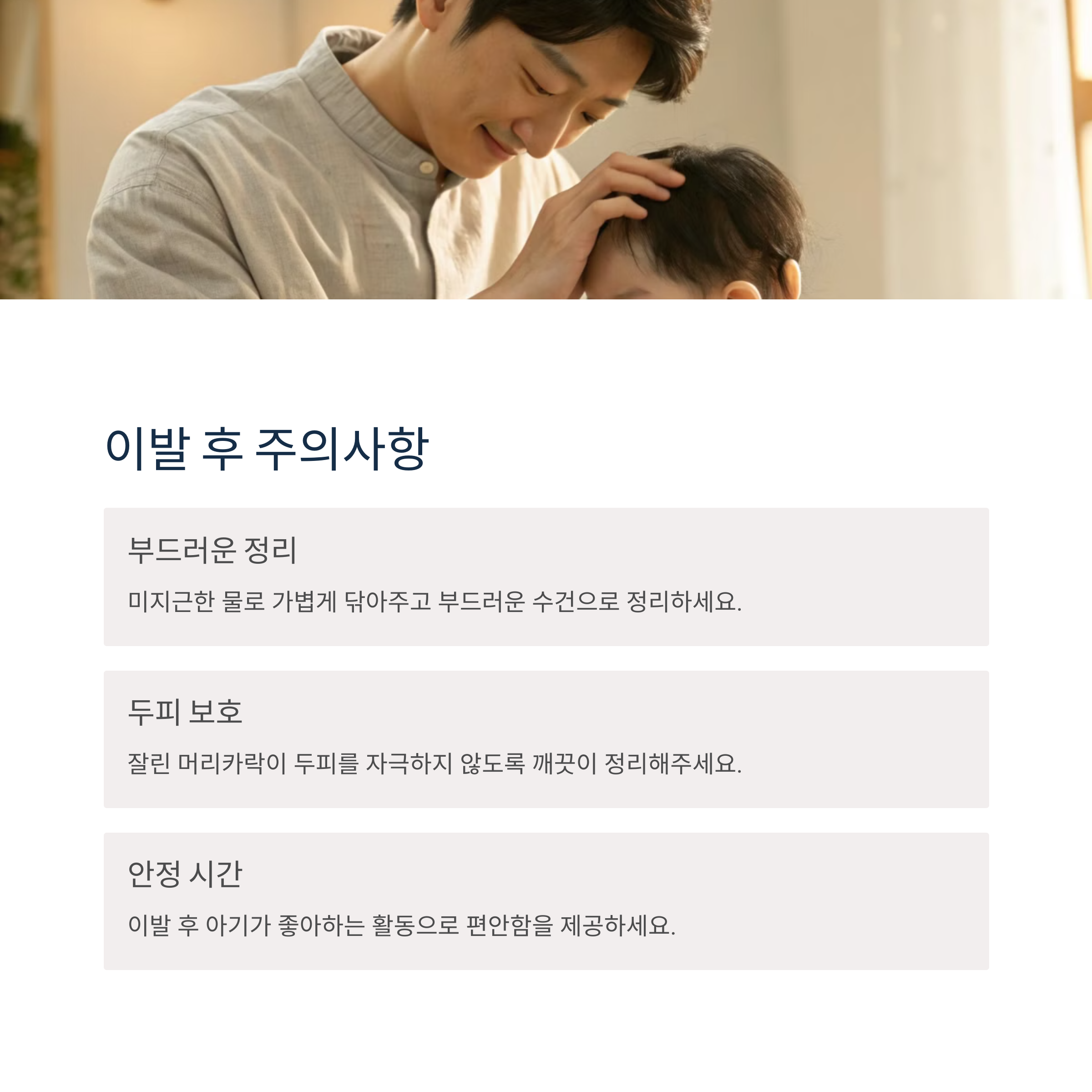 | 이발 시기 | 일반적으로 생후 6개월~12개월 사이에 첫 이발을 하는 경우가 많으며, 머리숱이 많거나 눈을 찌르는 경우 시기를 앞당길 수 있습니다. |