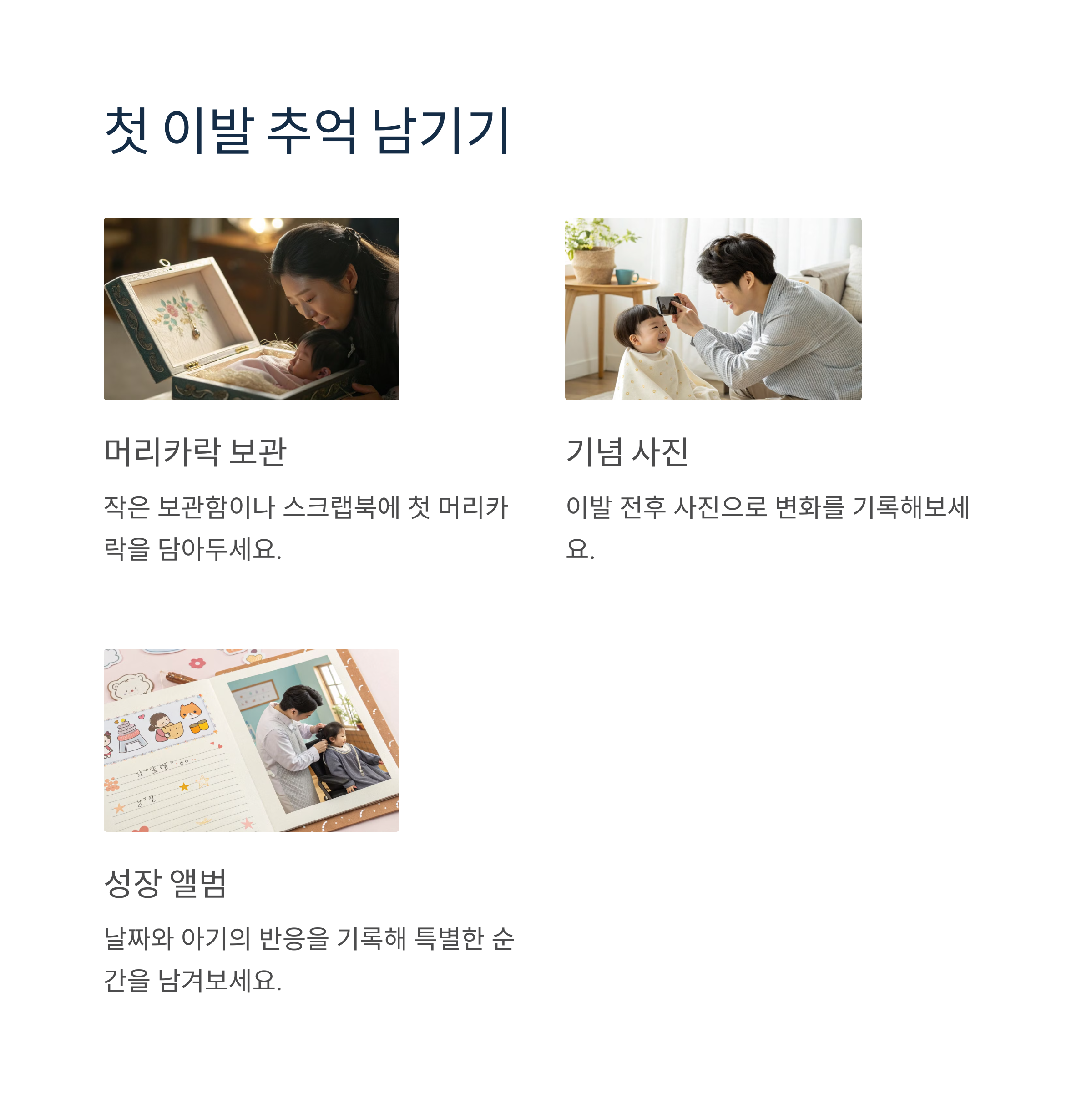 이발을 특별한 추억으로 만들고 싶다면, 머리카락을 소량 보관해두거나 사진을 남기는 것도 좋은 방법입니다. 첫 이발은 단지 머리를 자르는 것이 아니라, 아기의 성장을 기념하는 소중한 순간이 될 수 있어요.