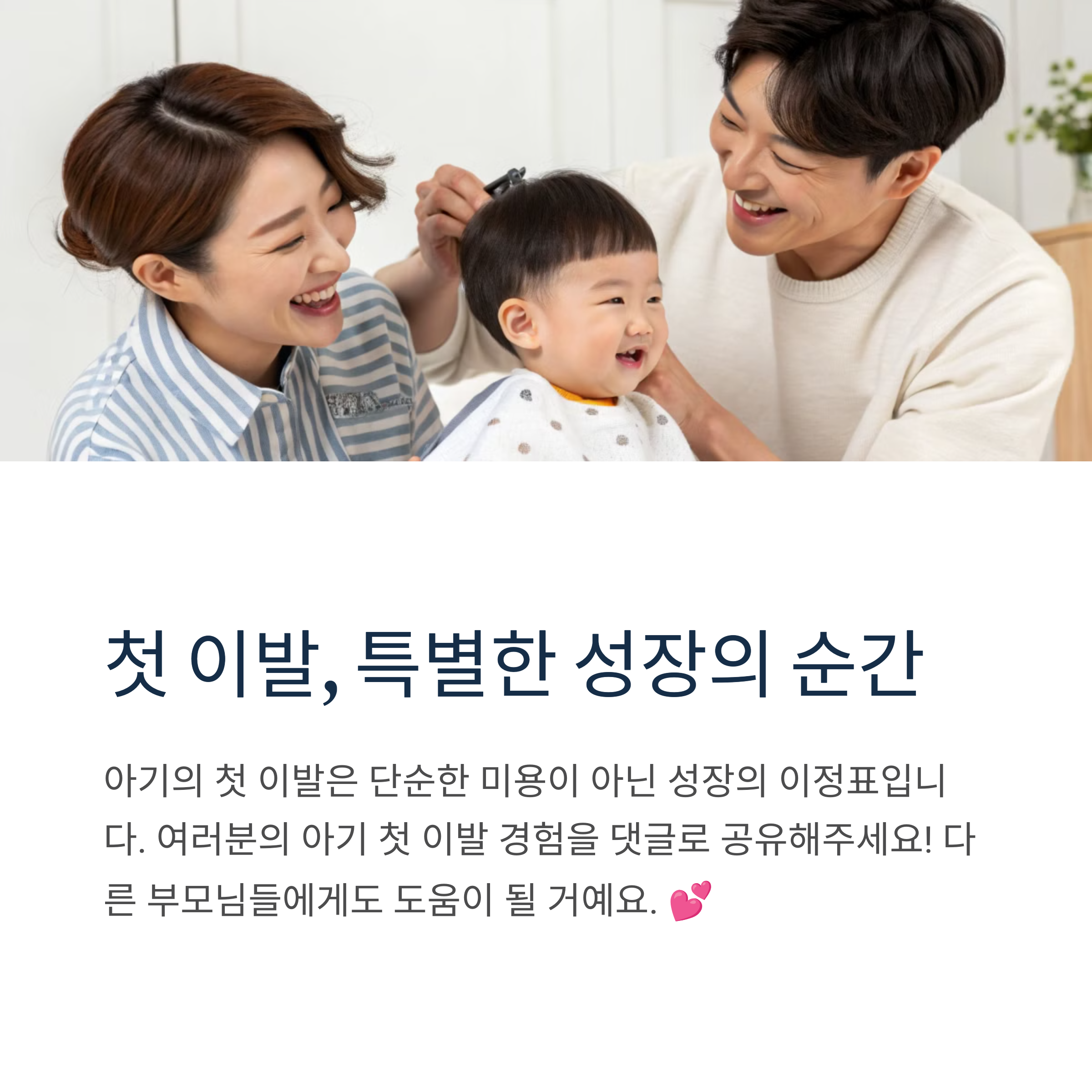 우리 아기의 첫 이발 경험, 기억에 남는 순간이나 꿀팁이 있다면 댓글로 나눠주세요. 다른 부모님에게 큰 도움이 될 수 있어요.