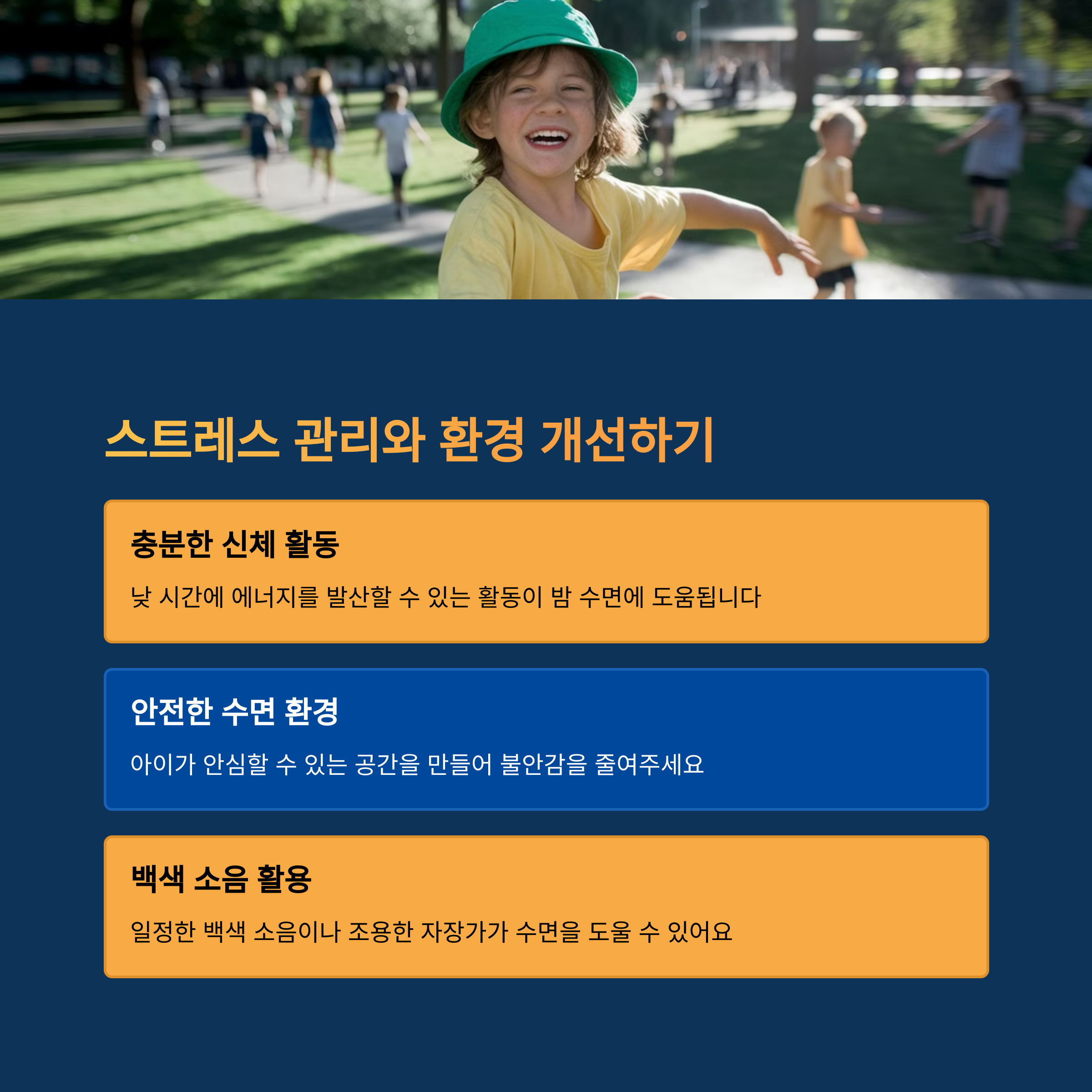 | 마사지나 따뜻한 찜질로 근육의 이완을 도울 수 있습니다. | 아이가 하루를 긍정적으로 마무리할 수 있도록 격려와 공감이 필요합니다. | 적정 온도 유지와 어두운 조명, 조용한 환경 조성으로 수면의 질을 높입니다. |