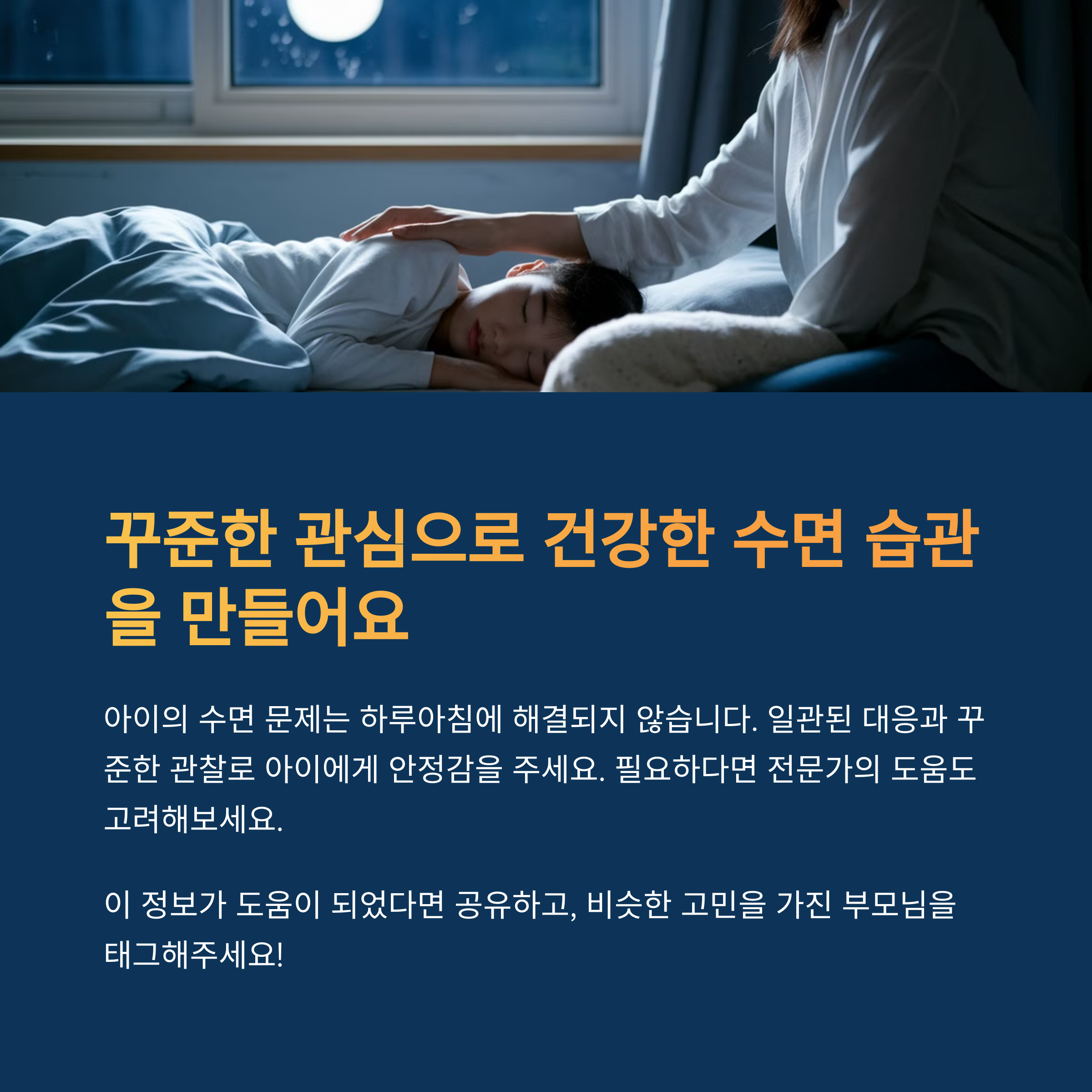 아이가 밤에 자주 깨는 문제를 해결하기 위해서는 부모의 관심과 꾸준한 관리가 필수적입니다. 아이의 상황에 맞는 맞춤형 해결책을 적용하고, 부모도 함께 아이의 수면 패턴에 맞춰 유연하게 대처하는 것이 중요합니다. 무엇보다 아이가 심리적으로 안정감을 느끼도록 사랑과 관심을 꾸준히 보여주는 것이 장기적인 해결책이 될 수 있습니다.