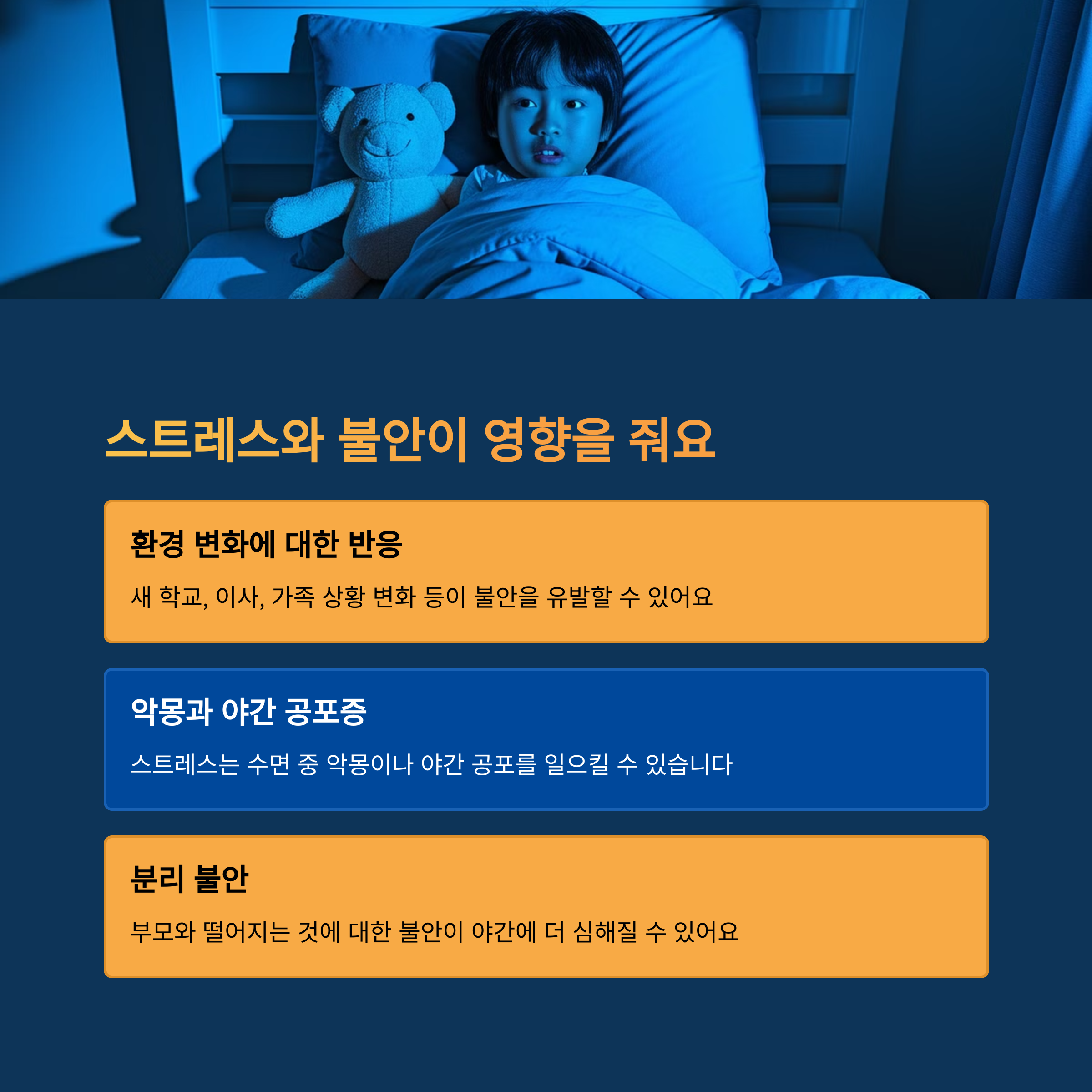 | 주요 원인 | 스트레스, 성장통, 환경 변화 등이 밤에 자주 깨는 주요 원인입니다. |