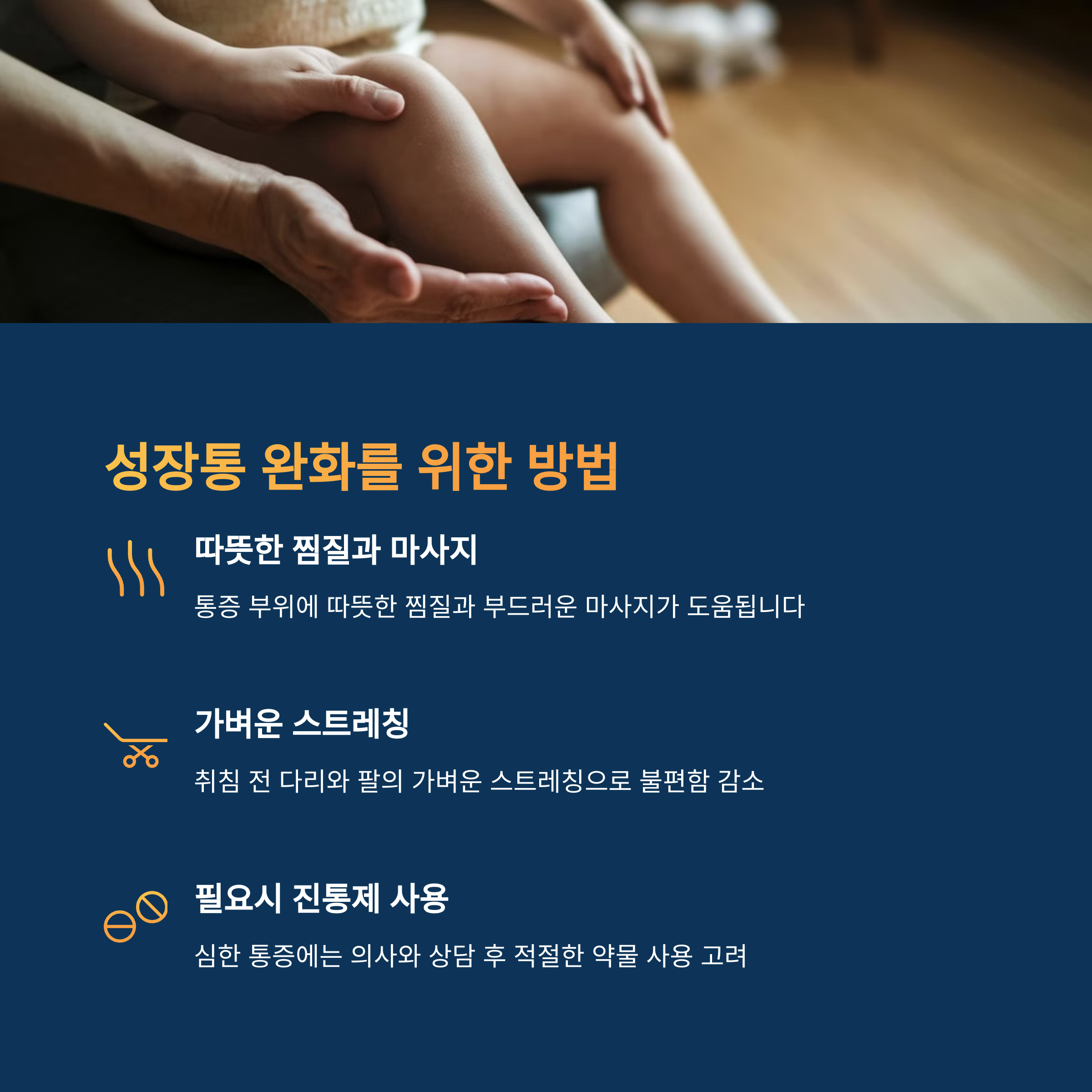 | 마사지나 따뜻한 찜질로 근육의 이완을 도울 수 있습니다. | 아이가 하루를 긍정적으로 마무리할 수 있도록 격려와 공감이 필요합니다. | 적정 온도 유지와 어두운 조명, 조용한 환경 조성으로 수면의 질을 높입니다. |