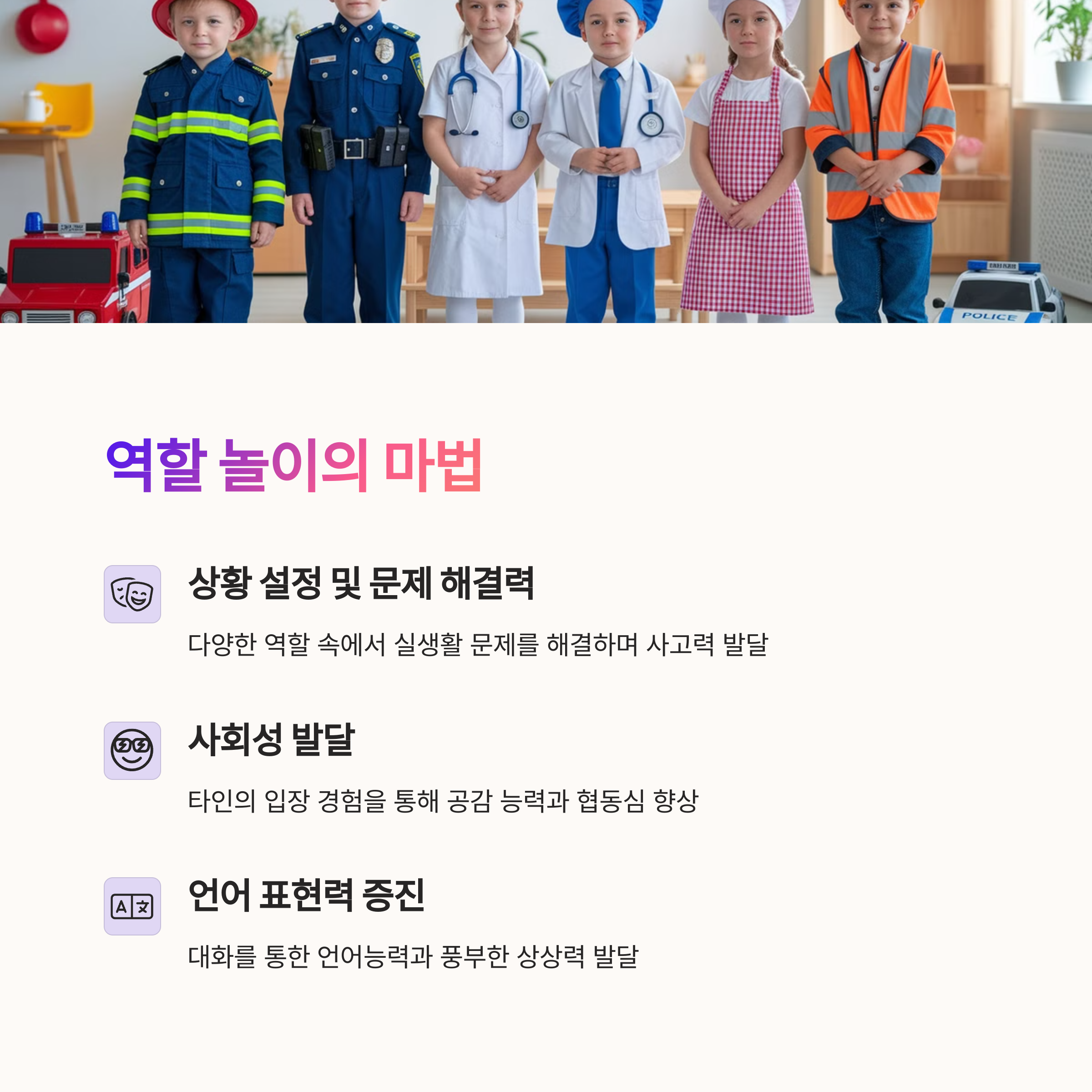 역할 놀이와 미술 활동이 가장 쉽고 효과적입니다. 일상 속에서 꾸준히 실천해보세요.