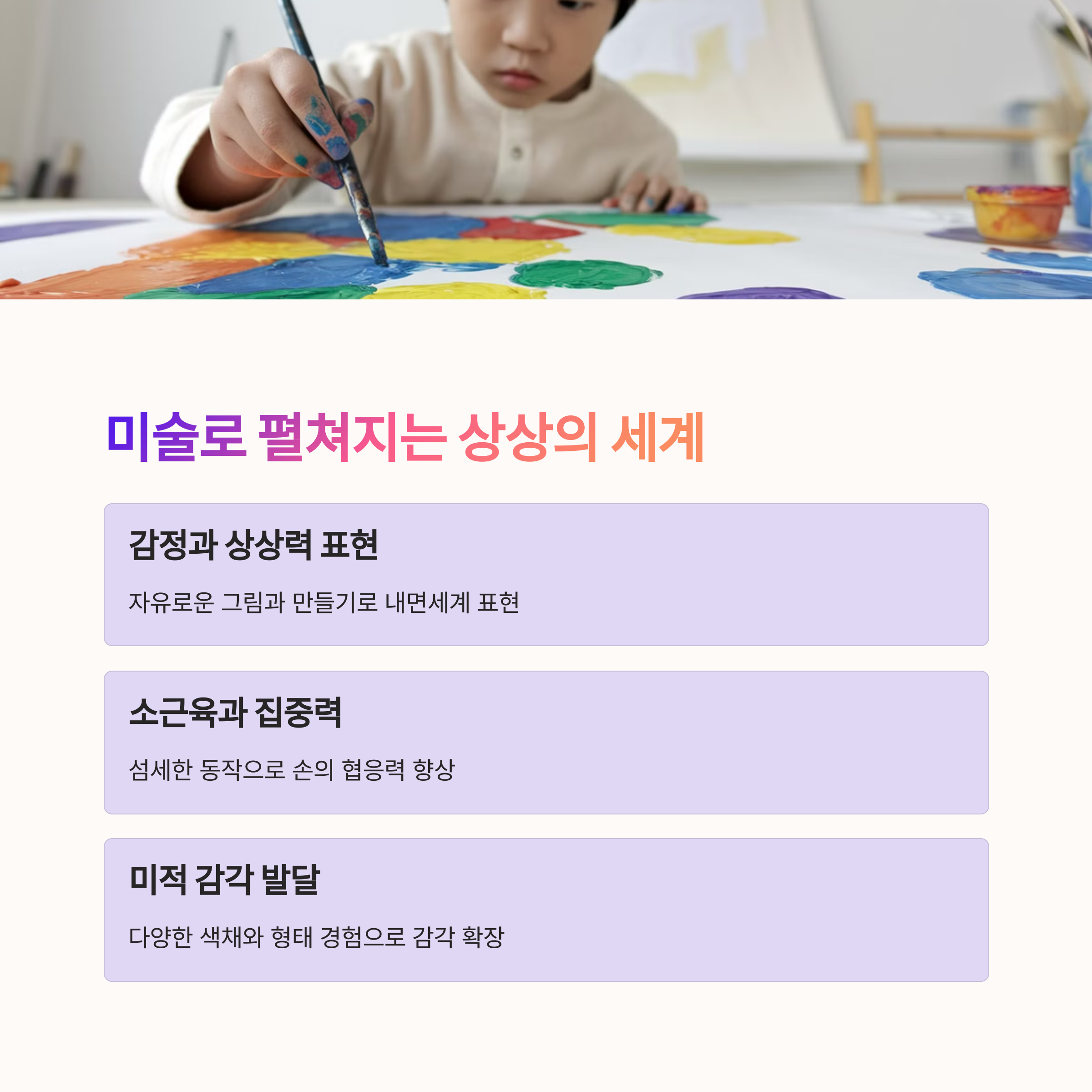 미술 활동도 창의력 발달에 큰 도움이 됩니다. 자유롭게 그림을 그리고 색칠하며 감정과 생각을 표현하게 해주세요. 종이접기, 클레이 만들기, 종이 공작 등도 아이의 상상력을 자극하고 소근육 발달에도 효과적입니다.