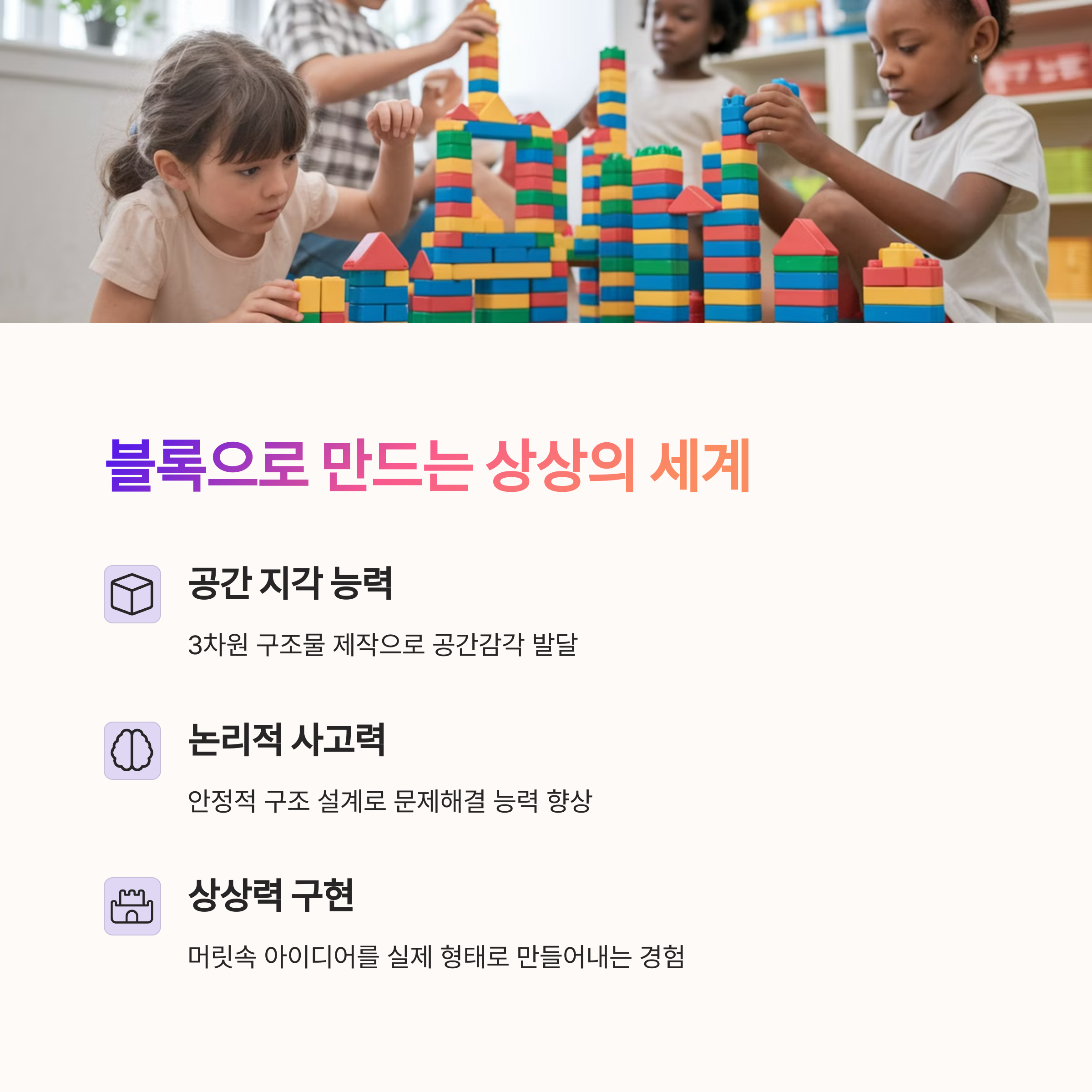 놀이를 통해 아이의 창의력은 자연스럽게 자라납니다. 부담을 주지 않고 즐거운 놀이 환경을 마련해 주세요. 놀이가 곧 학습과 발달의 기회가 됩니다.
