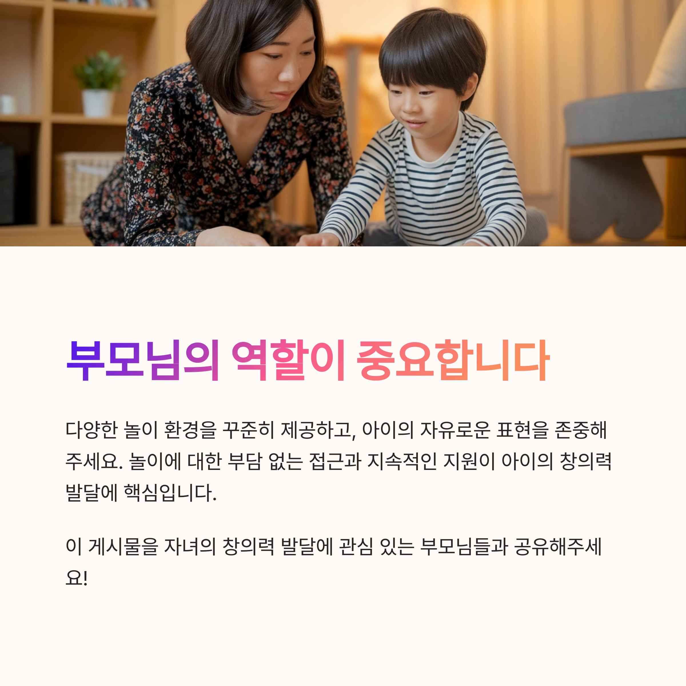 자녀와 함께 했던 창의력 놀이가 있다면 댓글로 공유해 주세요! 다른 부모님께 도움이 됩니다.