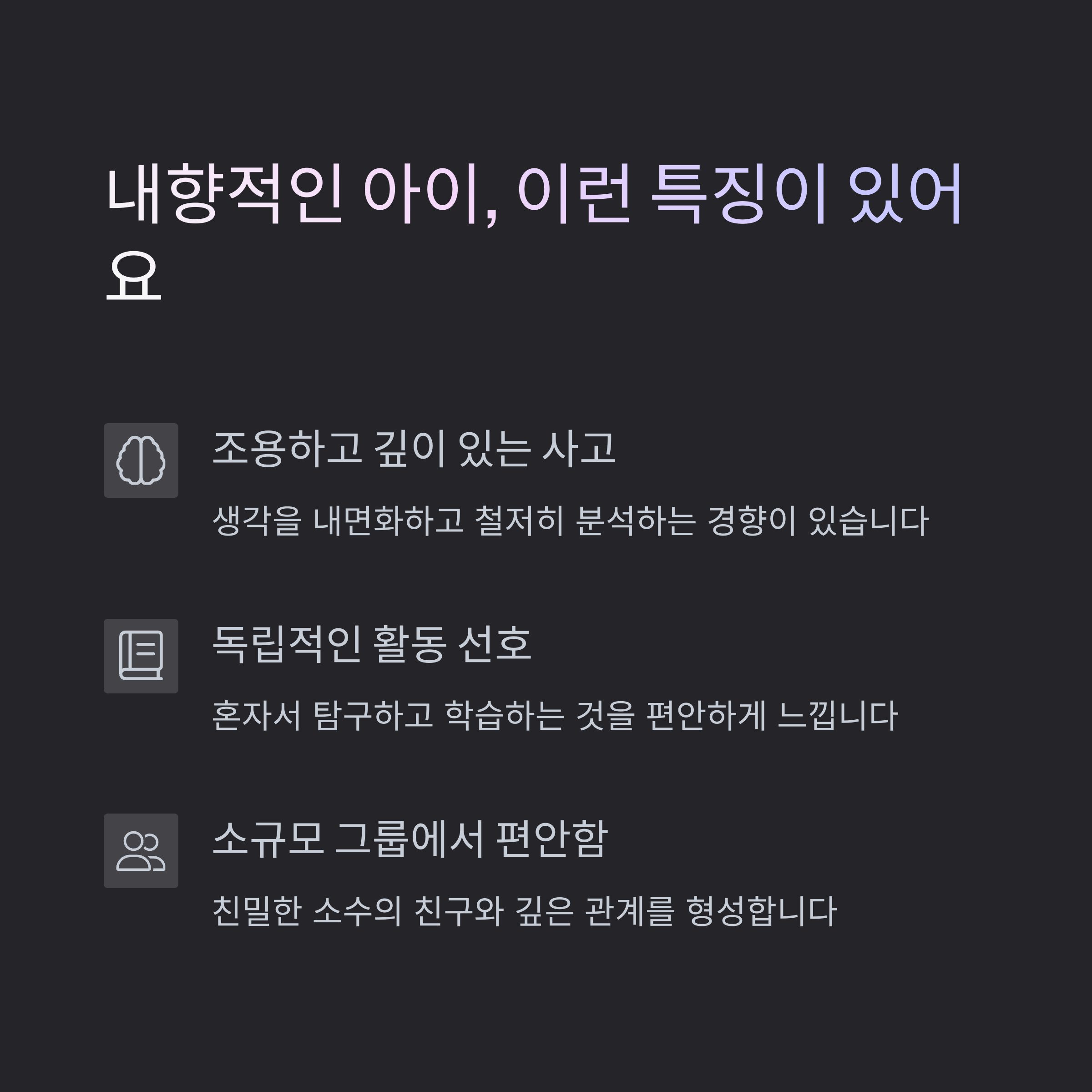 | 사람들과의 소통을 즐기며 활동적인 학습에 적극적입니다. | 혼자 생각하고 탐구하는 시간을 좋아합니다. | 아이 성격을 고려한 학습법은 자존감과 성취감을 키워줍니다. |