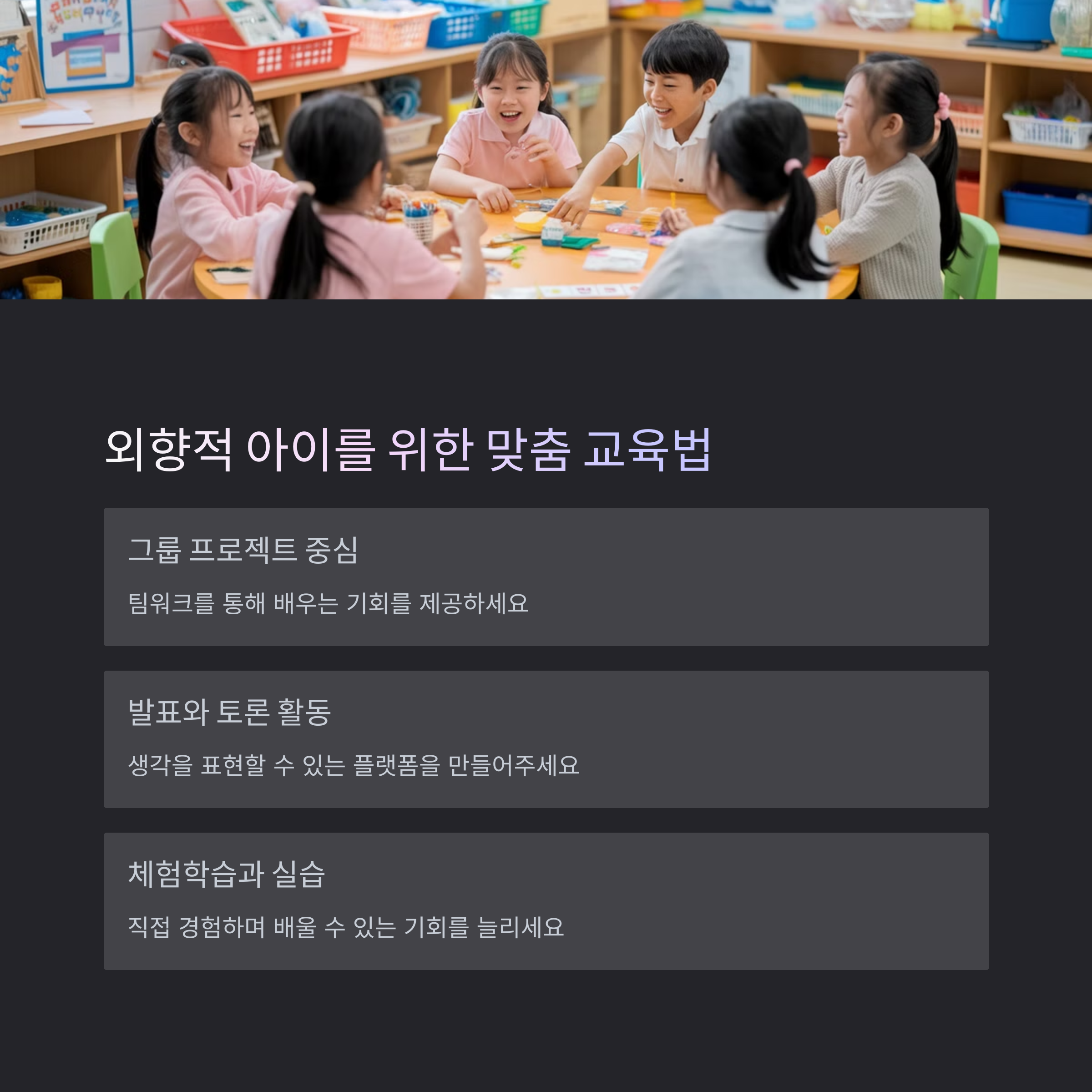 | 외향적 아이 | 내향적 아이 | 맞춤형 교육 |