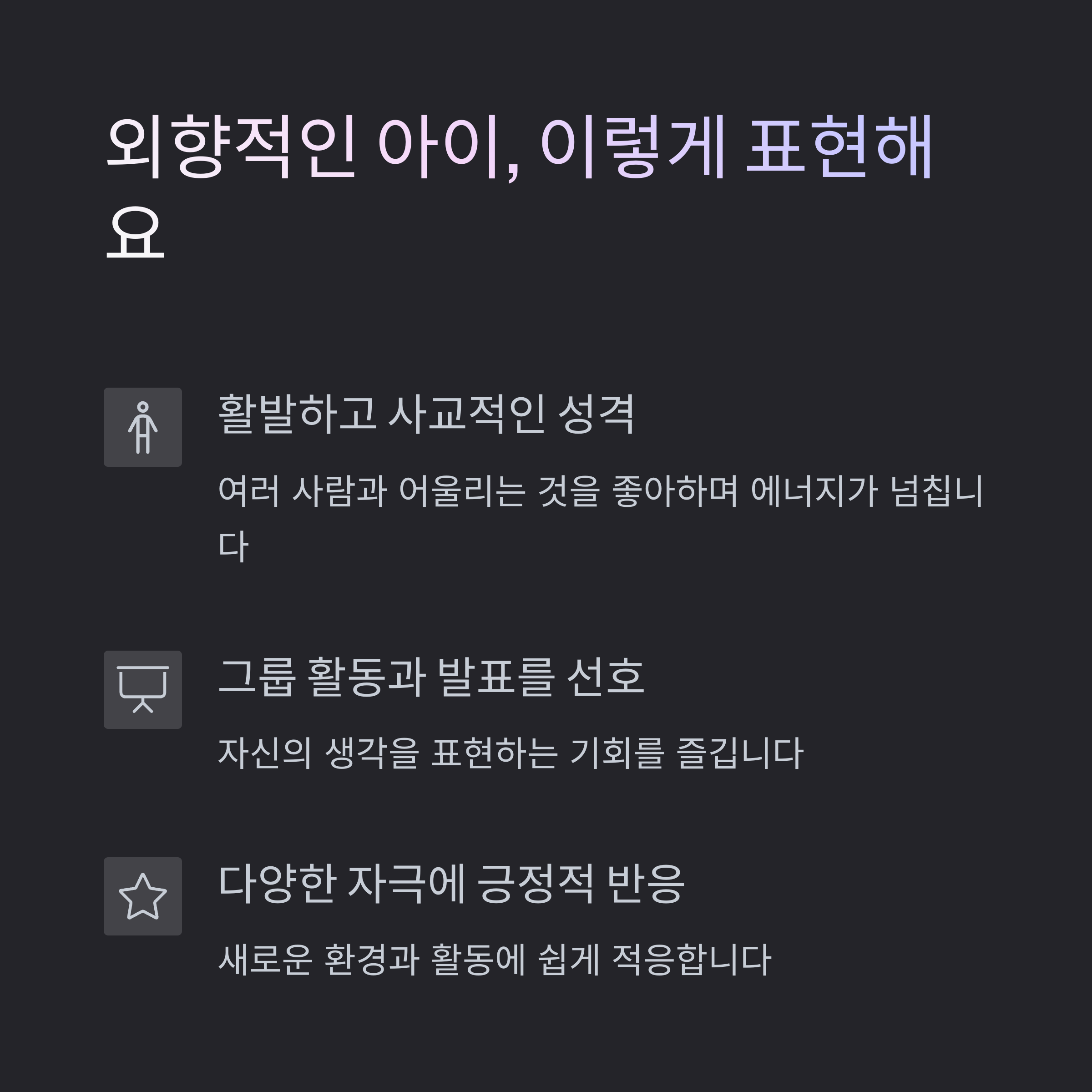 | 사람들과의 소통을 즐기며 활동적인 학습에 적극적입니다. | 혼자 생각하고 탐구하는 시간을 좋아합니다. | 아이 성격을 고려한 학습법은 자존감과 성취감을 키워줍니다. |