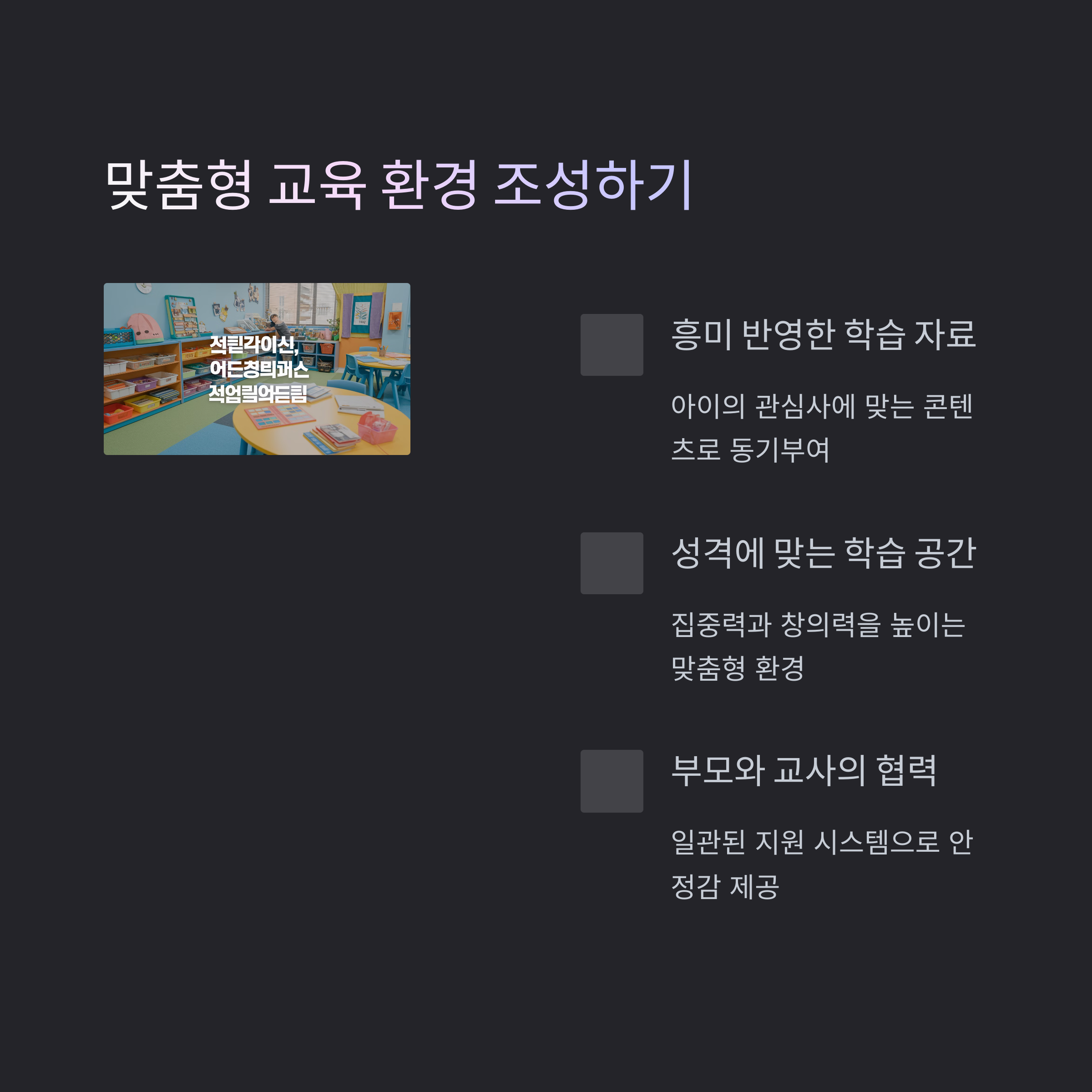 | 그룹 활동, 놀이 중심 교육, 발표와 토론을 선호합니다. | 개인 학습, 독서, 조용한 환경에서 학습 효과가 높습니다. | 성향에 맞는 환경과 커리큘럼을 적용하면 학습 효과가 높아집니다. |