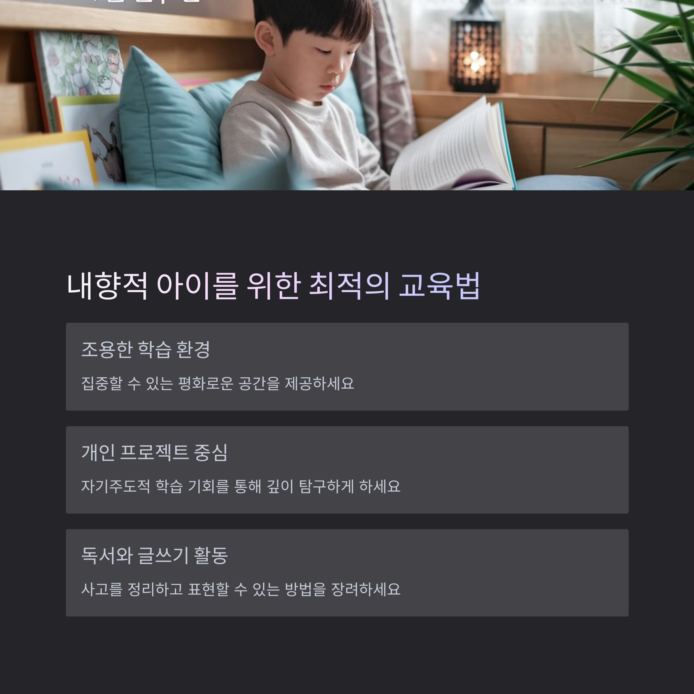 | 왜 중요한가 | 아이의 성격을 고려한 교육은 학습 의욕을 높이고 스트레스를 줄여줍니다. |