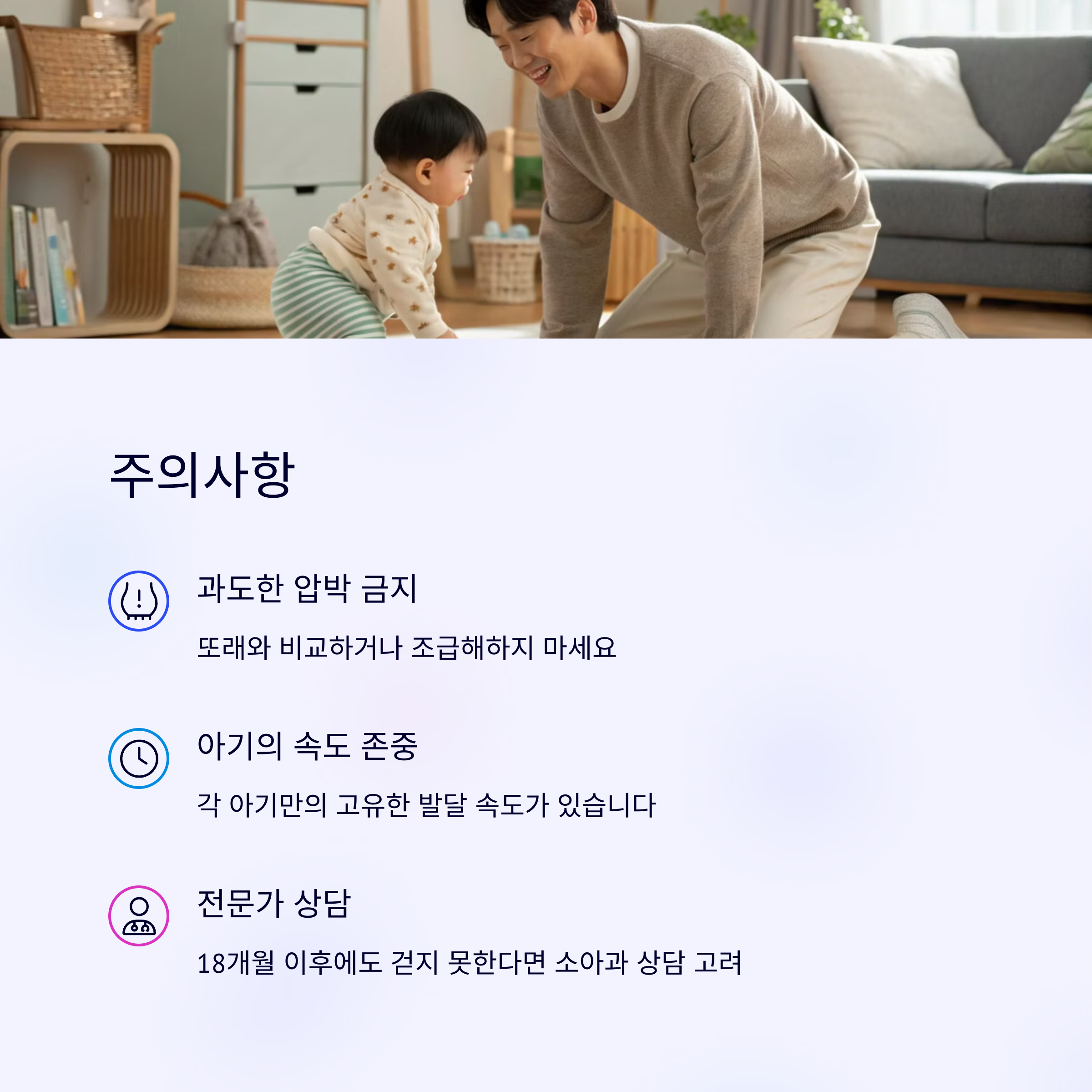 성급한 걱정보다는 발달 단계 전체를 관찰하세요. 아이가 주도적으로 움직일 수 있도록 유도해 주세요. 무리한 훈련보다는 놀이처럼 접근하세요.