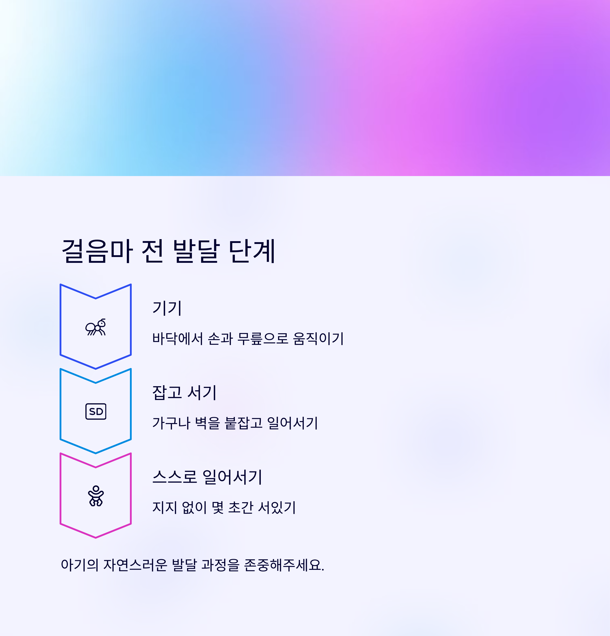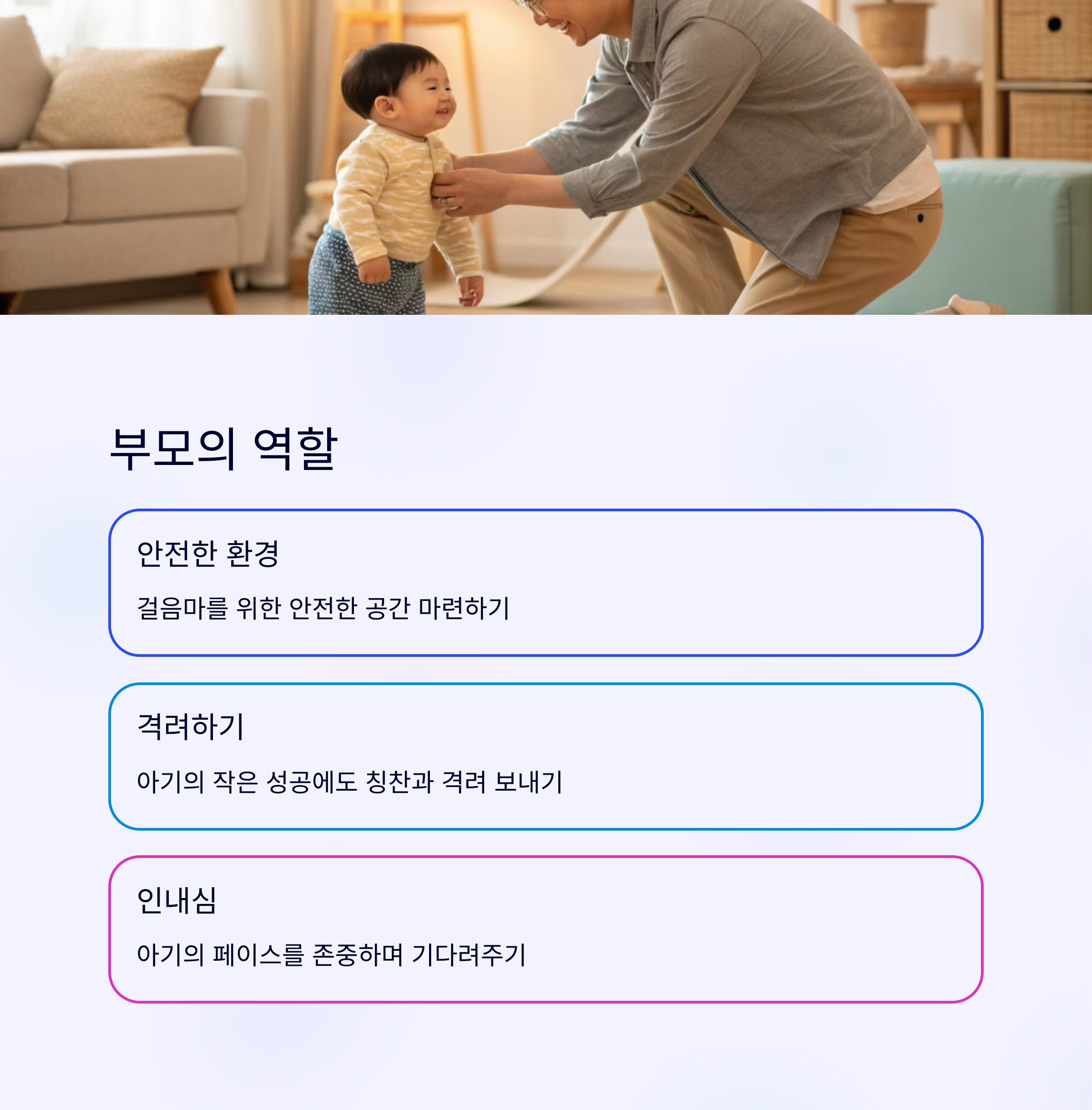 | 부모의 역할 | 아이가 스스로 걷고 싶어질 수 있도록 안전하고 격려하는 환경을 만들어주세요. |