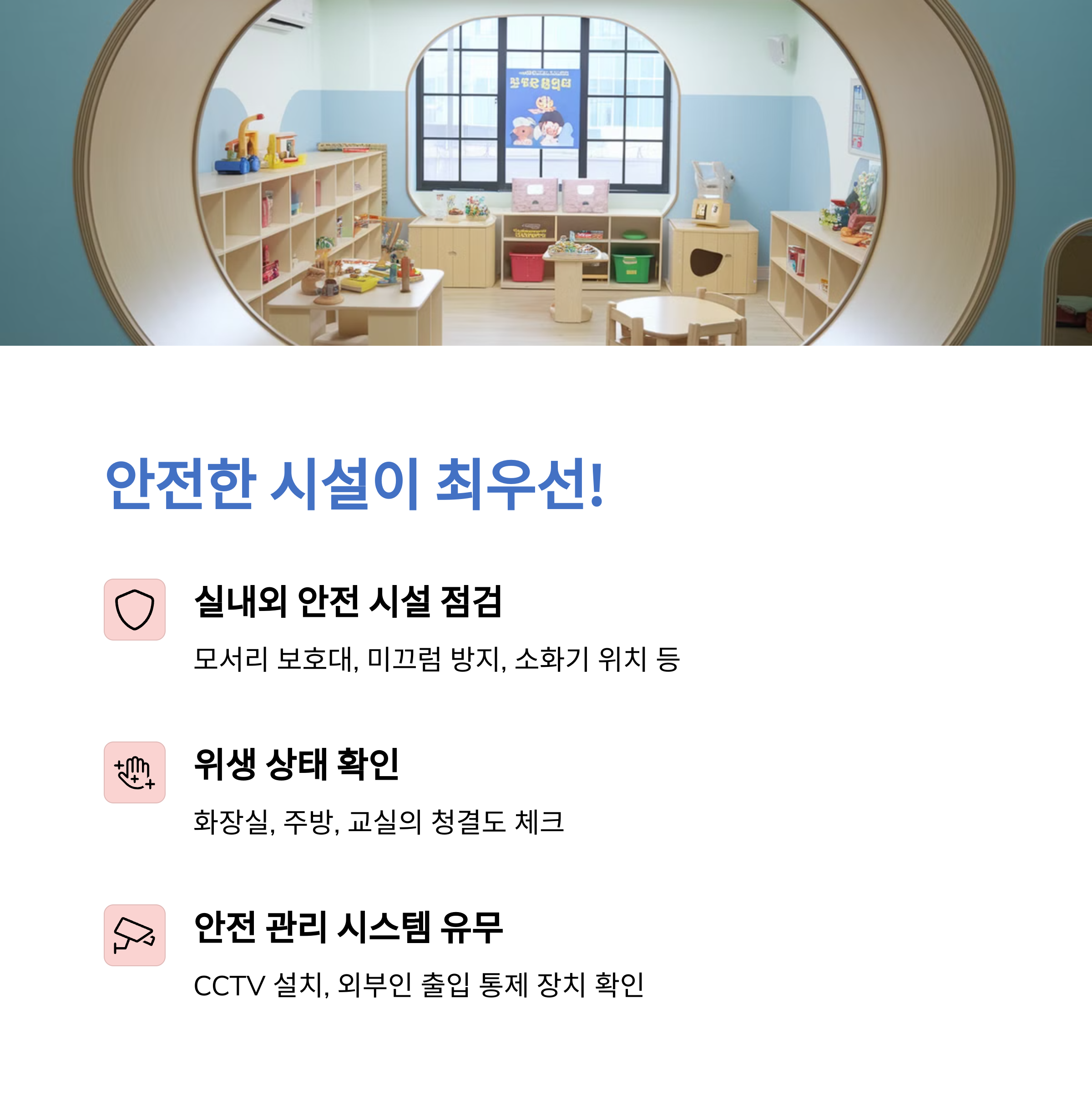 놀이기구와 실내 환경이 안전한지 체크합니다. 창의력, 사회성, 신체 활동 등 다양한 프로그램이 있는지 봅니다. 부모 상담과 공지가 체계적으로 이루어지는지 확인합니다.