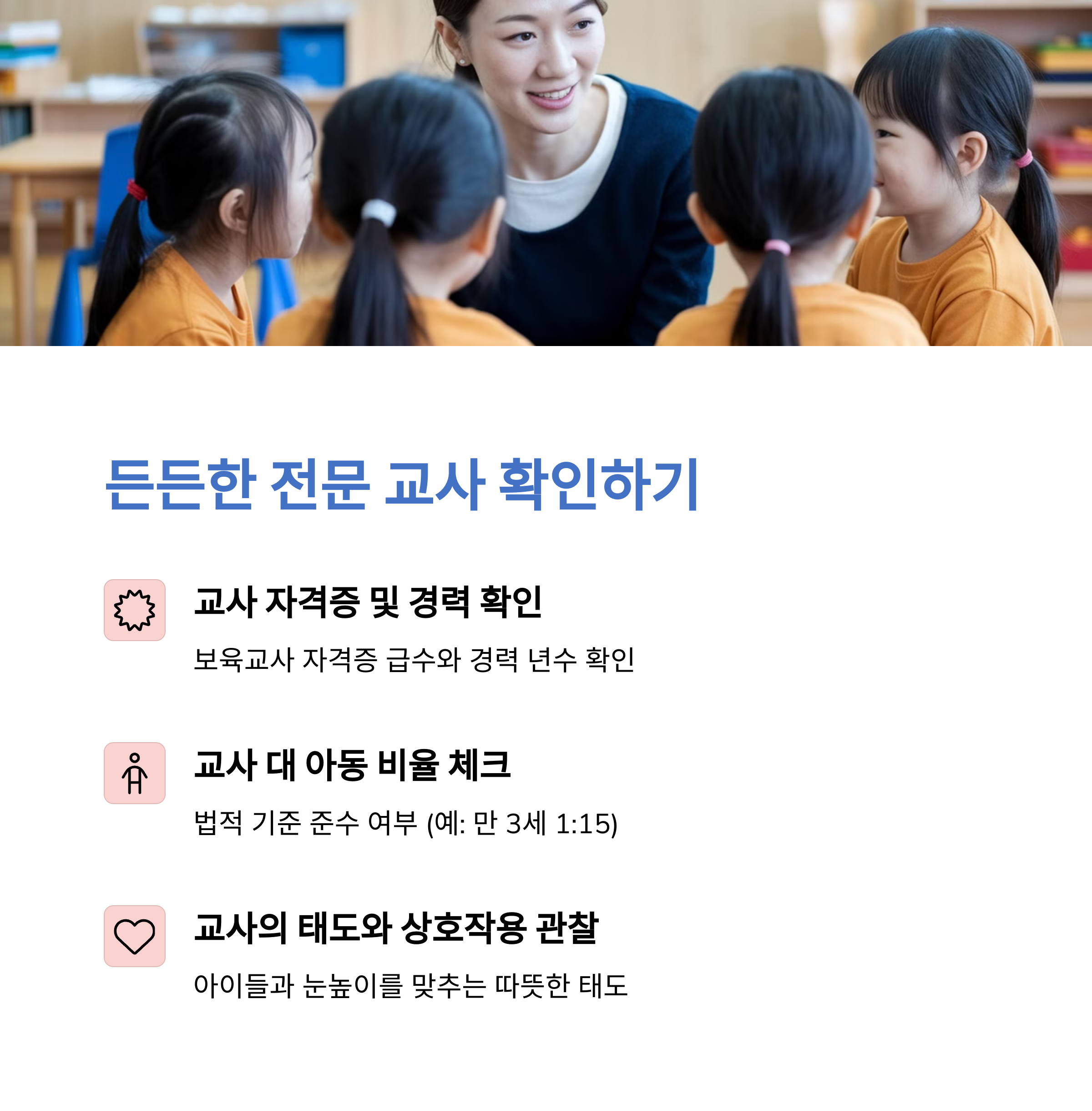보통 영아반은 교사 1명당 3~5명, 유아반은 1명당 7~15명이 적정 비율입니다. 아이가 충분한 관심과 보살핌을 받을 수 있는 비율인지 확인하세요.