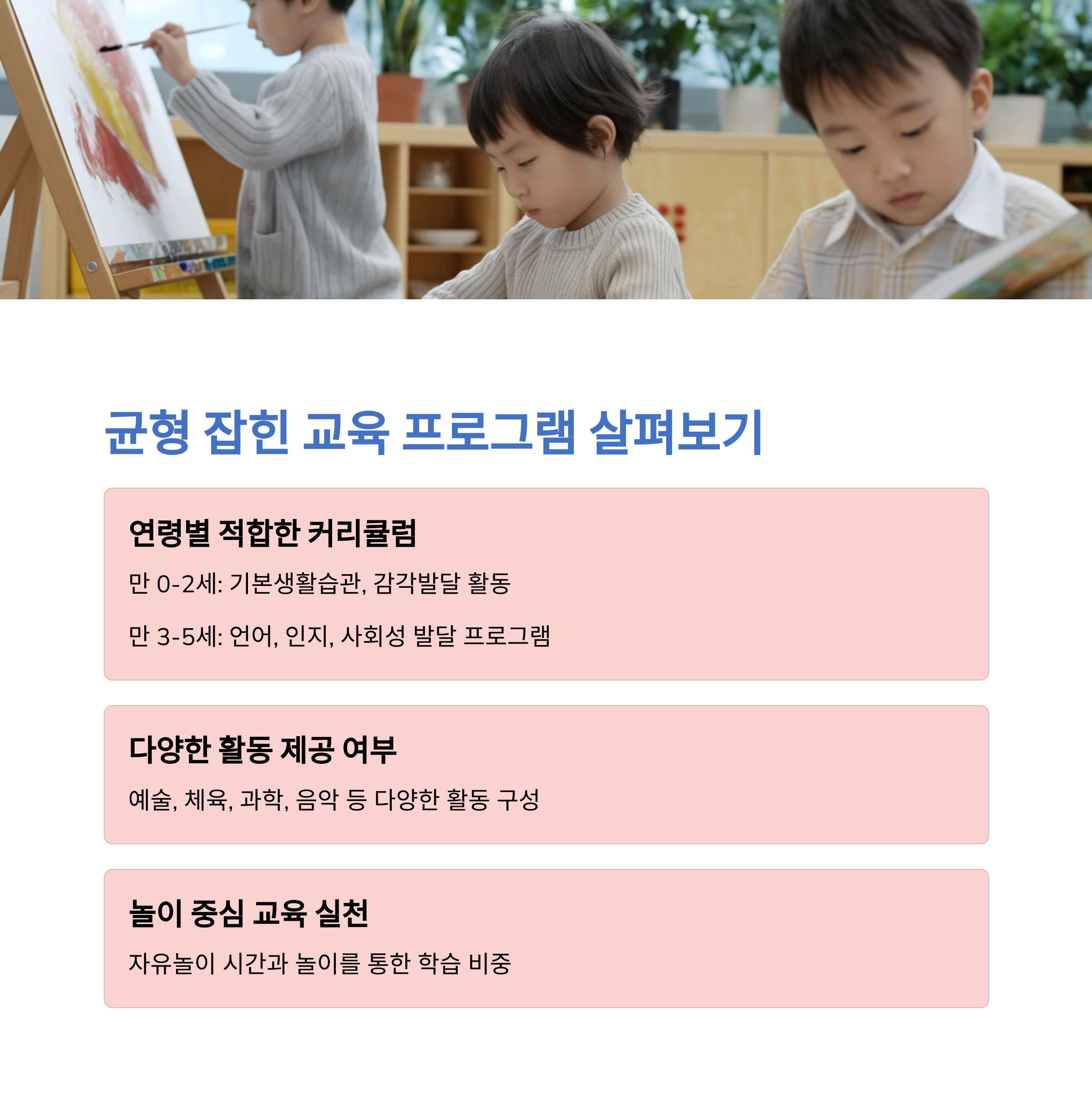 두 번째는 어린이집의 교육 프로그램입니다. 어린이집마다 교육 철학이나 커리큘럼이 다를 수 있기 때문에 우리 아이의 성향과 발달 단계에 맞는 프로그램을 제공하는지 살펴보는 것이 필요합니다. 창의력, 사회성, 신체 활동 등 다양한 요소가 균형 있게 구성되어 있는지 확인하고, 아이가 즐겁게 참여할 수 있는 활동이 많은지도 체크해야 합니다.