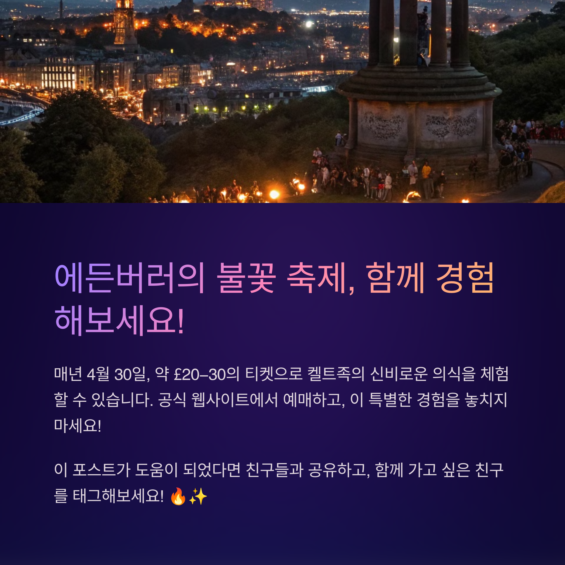오늘은 스코틀랜드의 대표 축제 중 하나인 에든버러 벨테인 불 축제를 소개해 드릴게요.