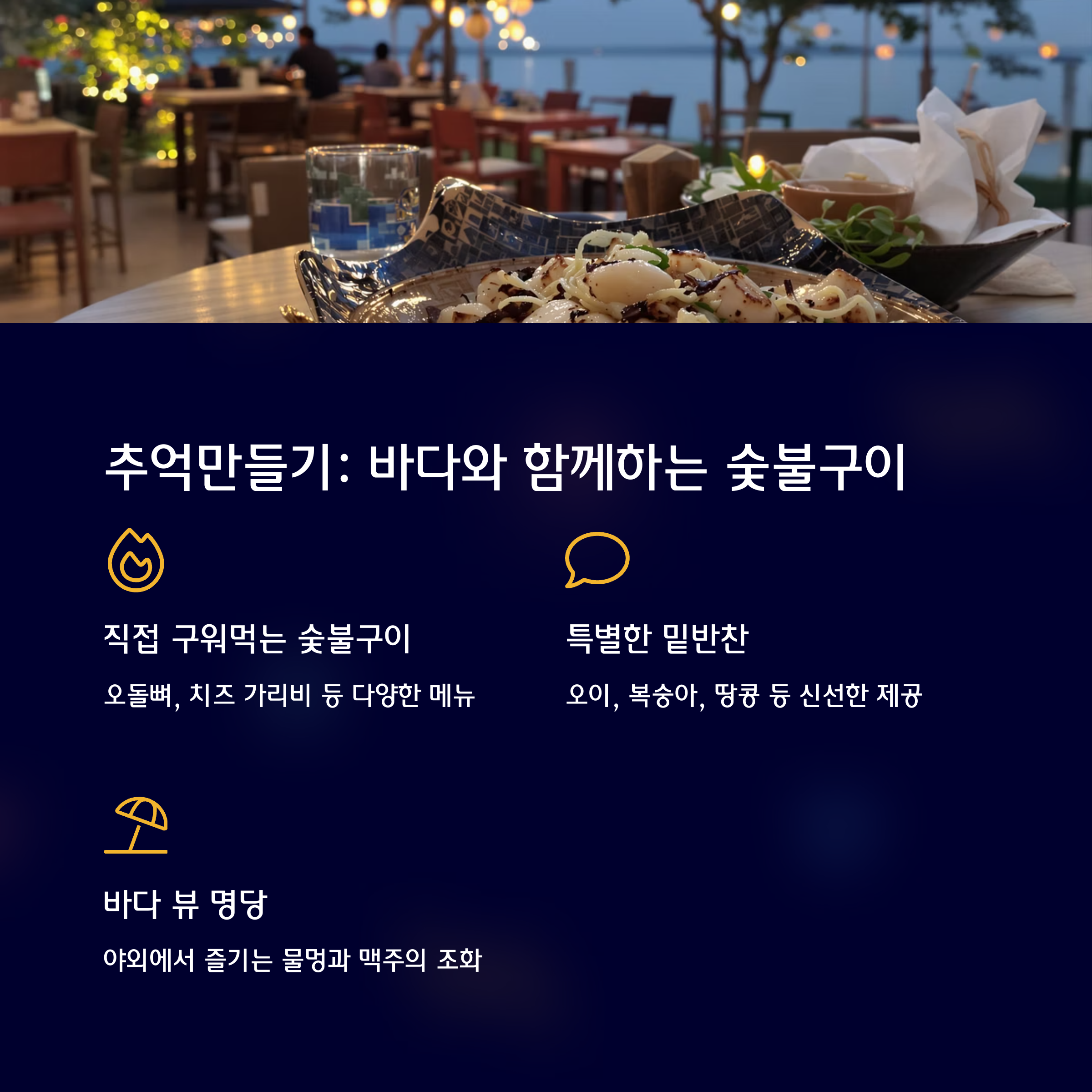 바닷바람을 맞으며 따뜻한 안주와 함께하는 시간은 일상의 스트레스를 잊게 만듭니다.