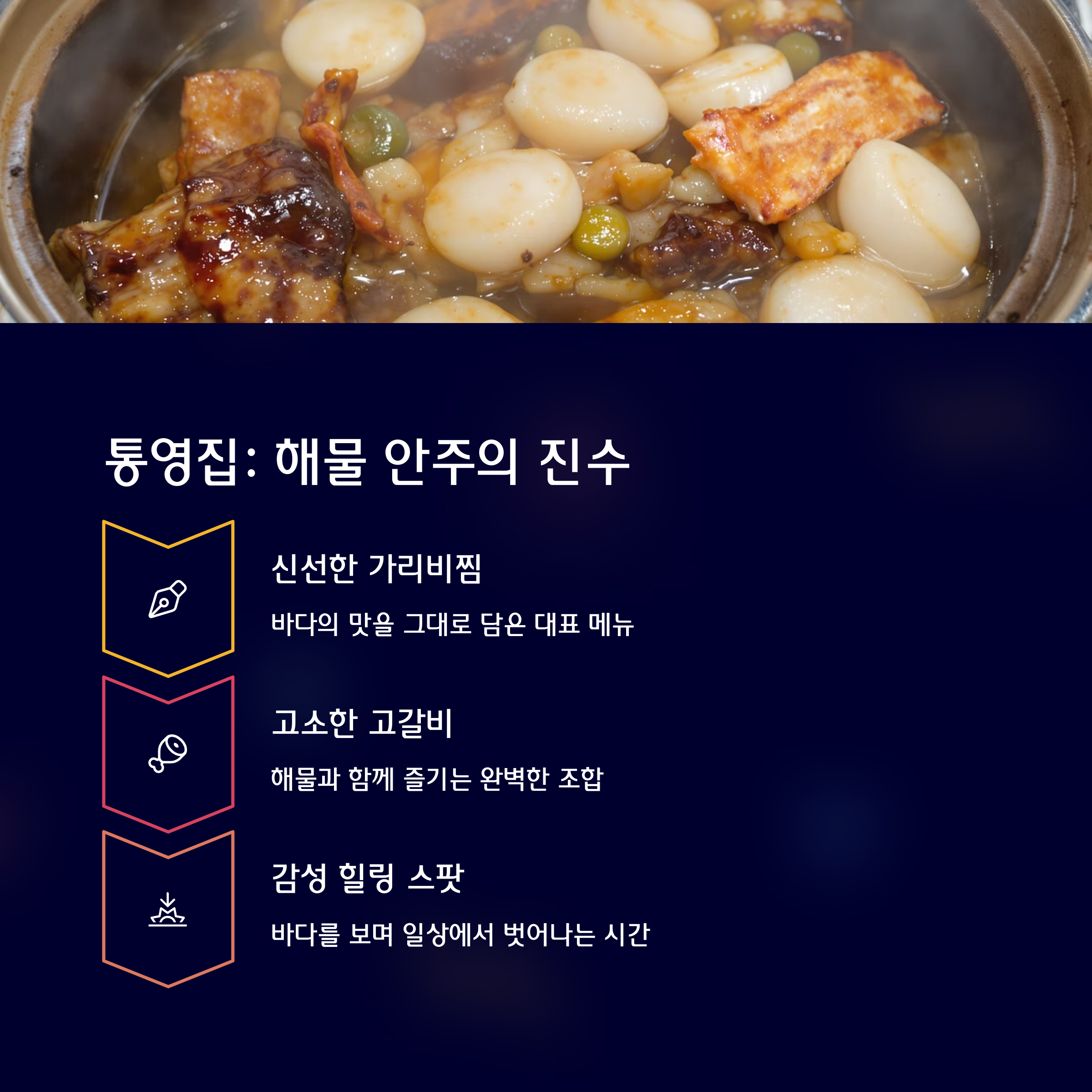 '접때 그 집'은 푸짐함과 친절함, '추억만들기'는 낭만적인 분위기, '통영집'은 해산물의 신선함이 강점이에요.