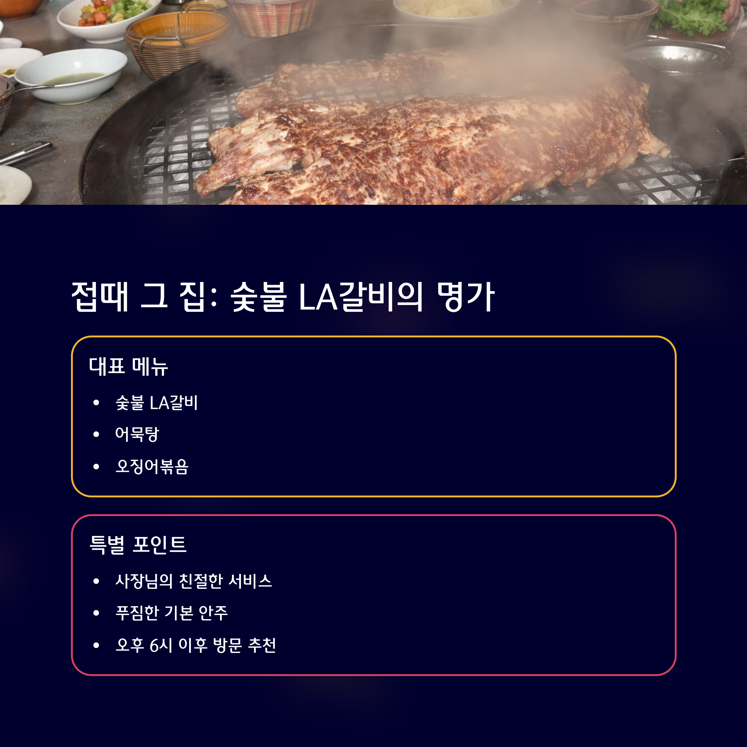 숯불에 구운 LA갈비의 진한 풍미와 칼칼한 어묵탕, 매콤한 오징어볶음이 이 집의 시그니처 메뉴입니다.