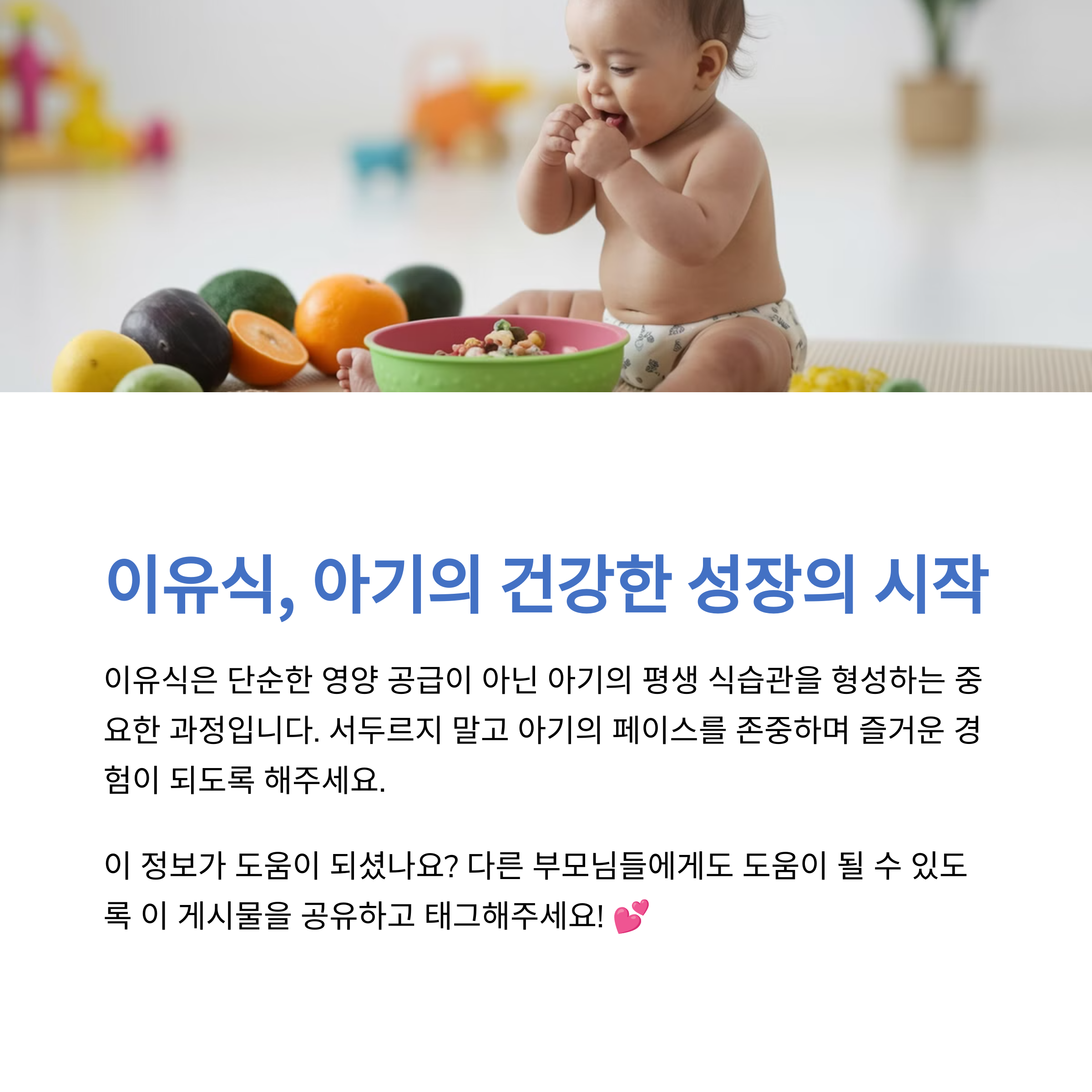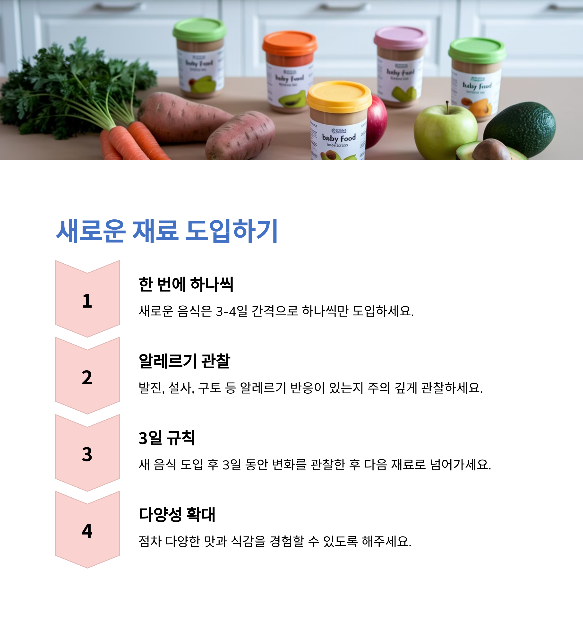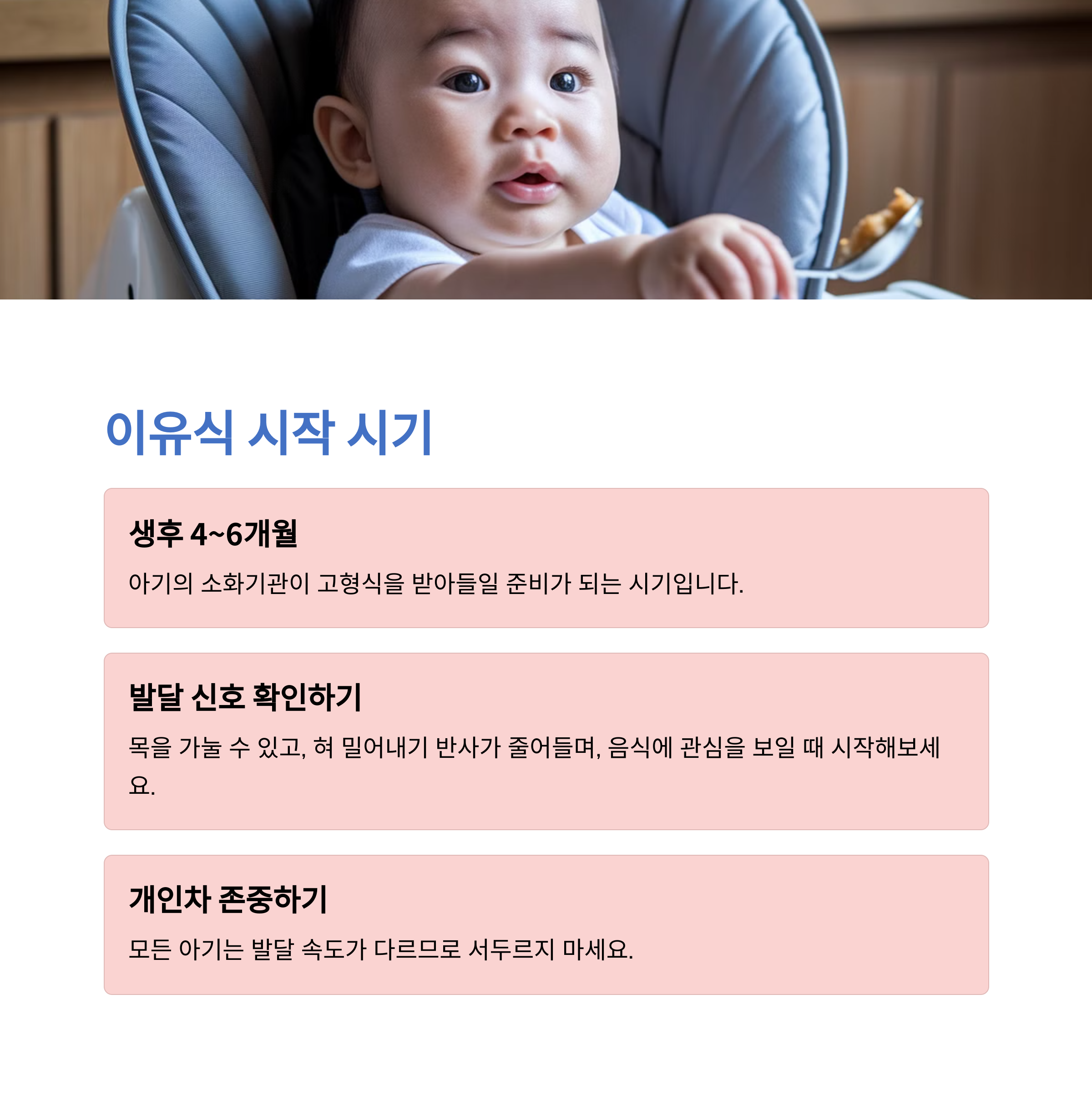 | 생후 4~6개월부터 서서히 시작 | 쌀미음, 채소 퓌레, 부드러운 재료 | 긍정적인 분위기에서 시도 |