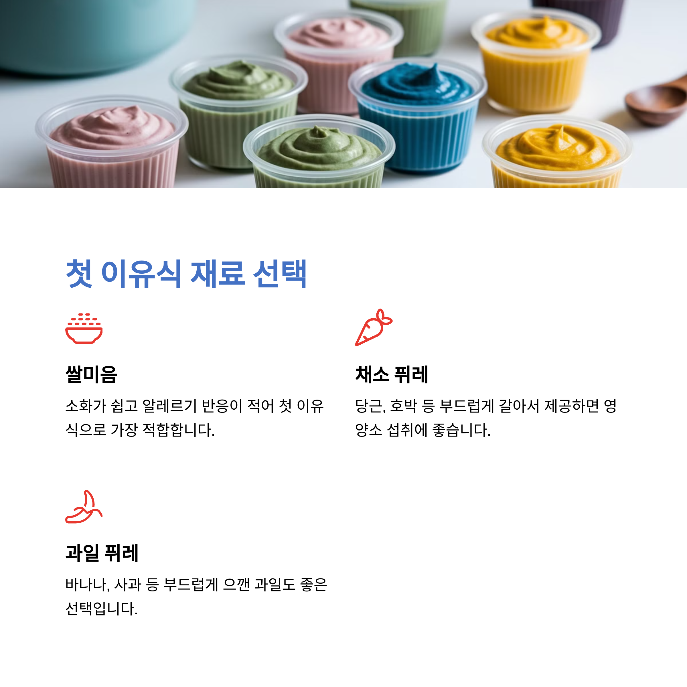 | 초기 이유식 재료 | 쌀미음, 감자, 당근 등 부드러운 식재료 |