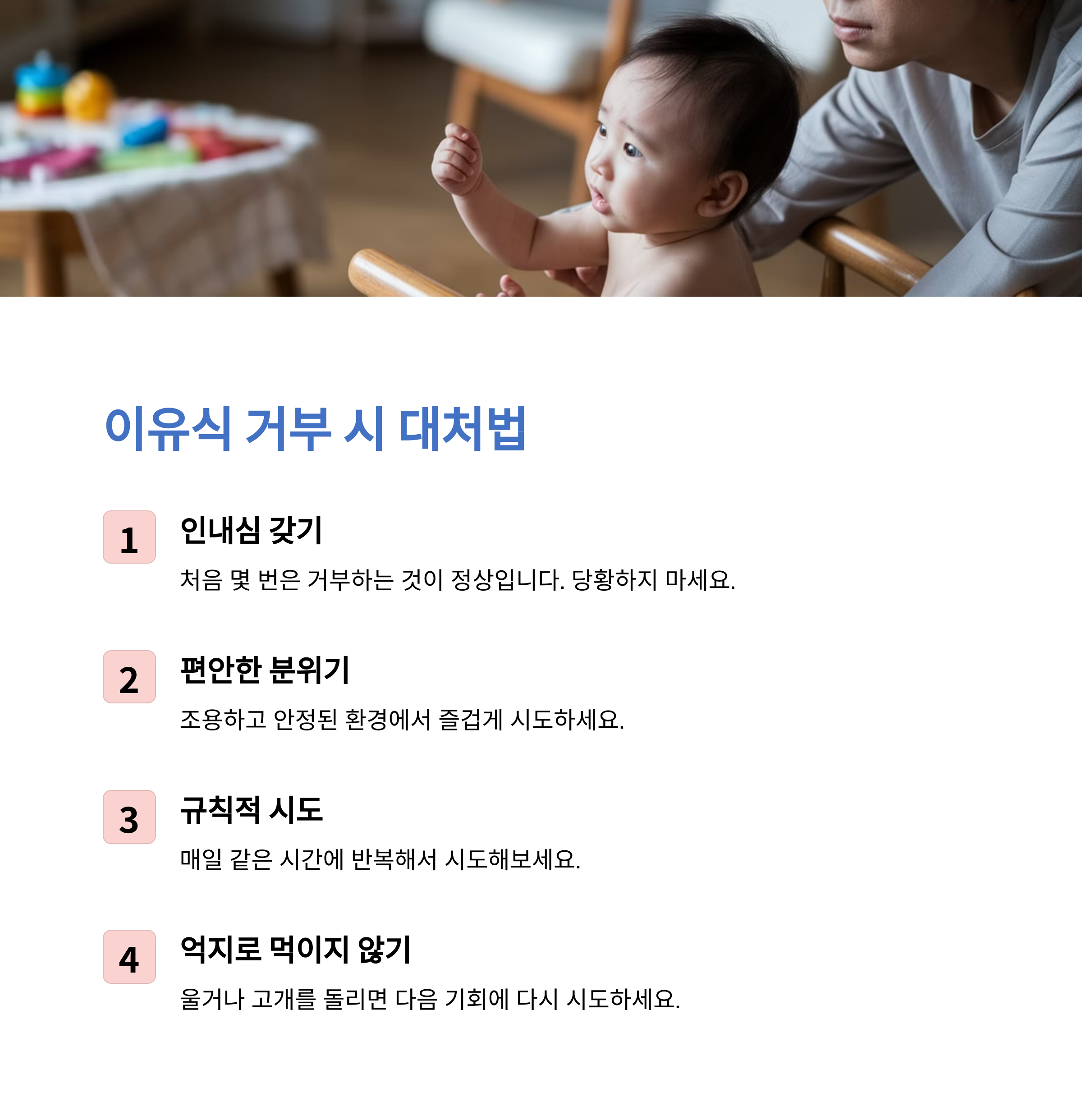 이유식 거부는 자연스러운 현상입니다. 억지로 먹이기보다 며칠 후 다시 시도해보세요. 즐거운 분위기를 만들어주는 것도 중요합니다.
