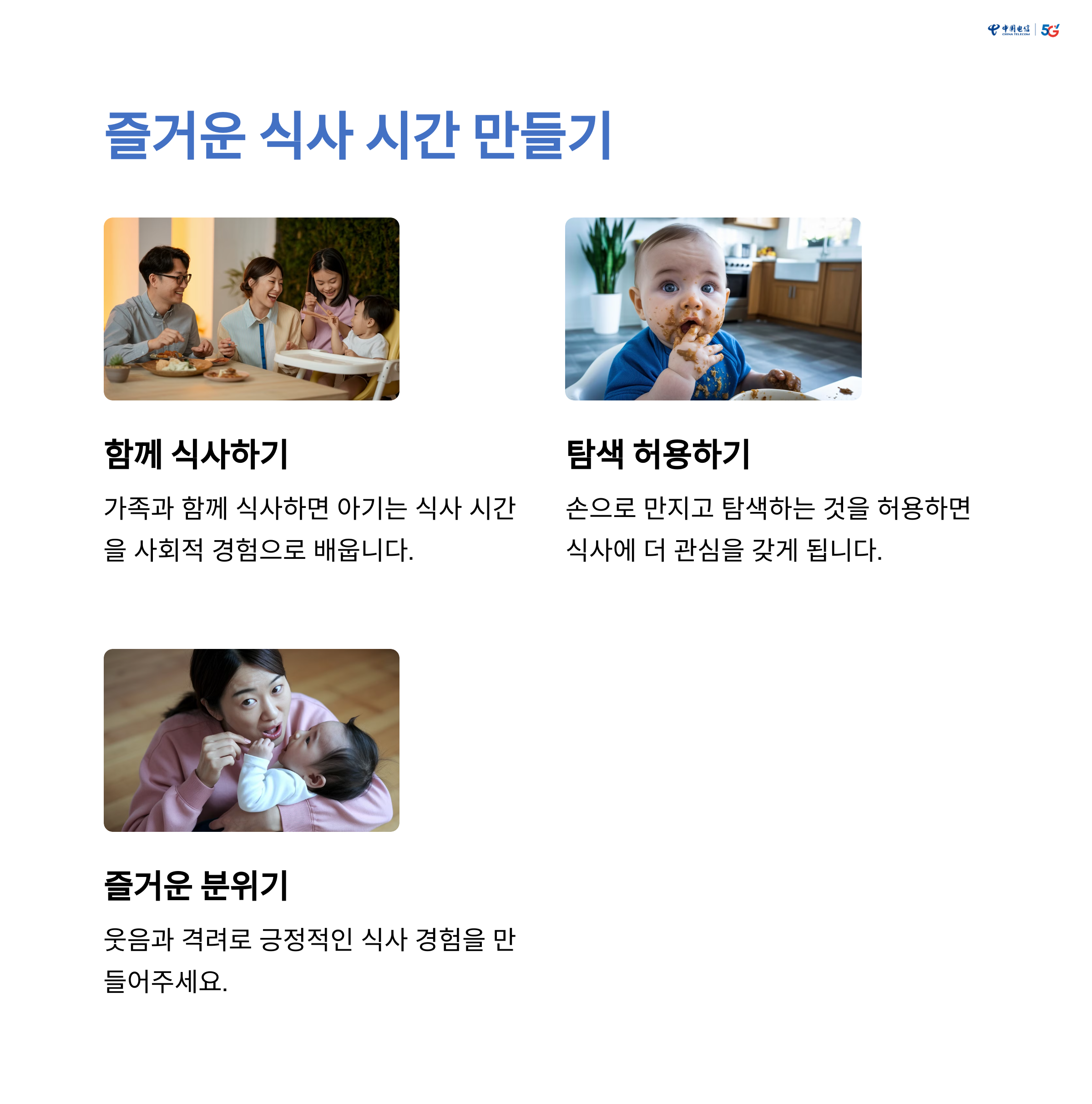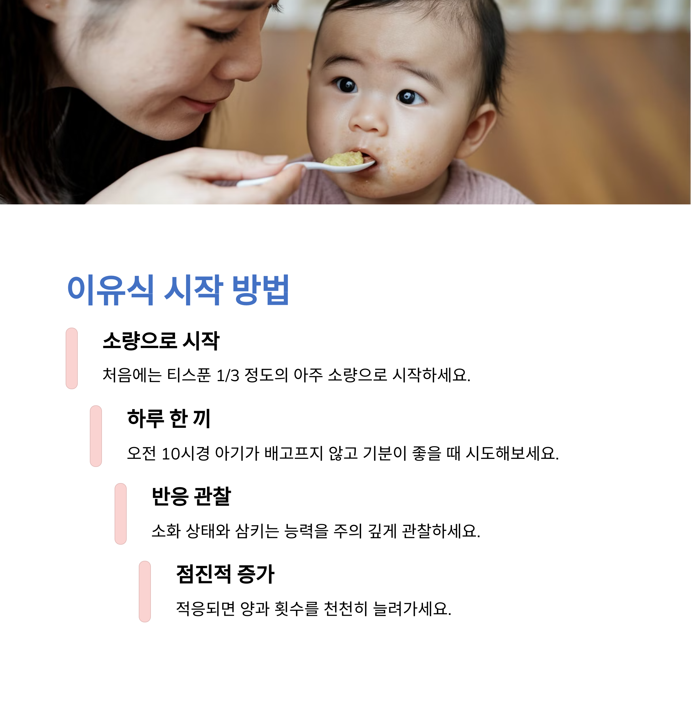 | 생후 4~6개월부터 서서히 시작 | 쌀미음, 채소 퓌레, 부드러운 재료 | 긍정적인 분위기에서 시도 |