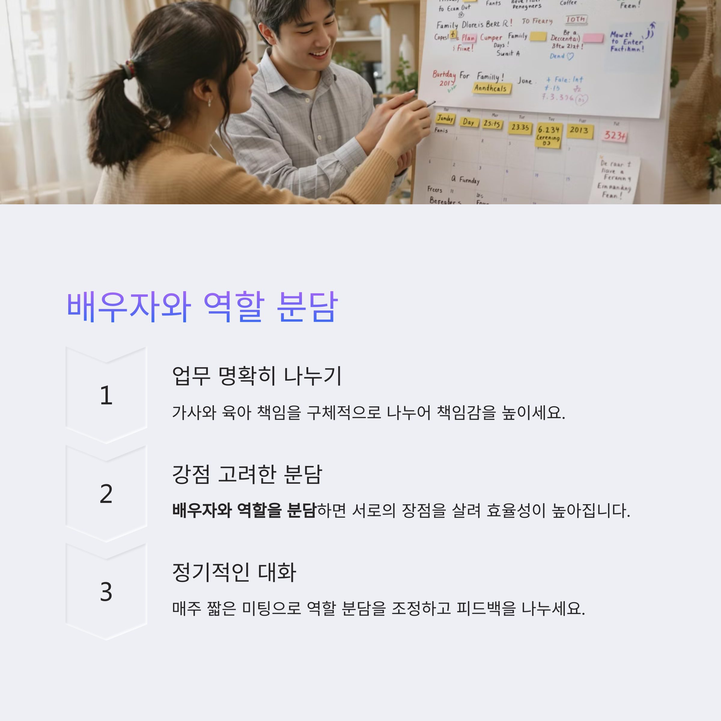 육아와 집안일을 혼자 다 하면 스트레스가 쌓입니다. 배우자와 역할을 분담해 부담을 나누는 것이 중요합니다.