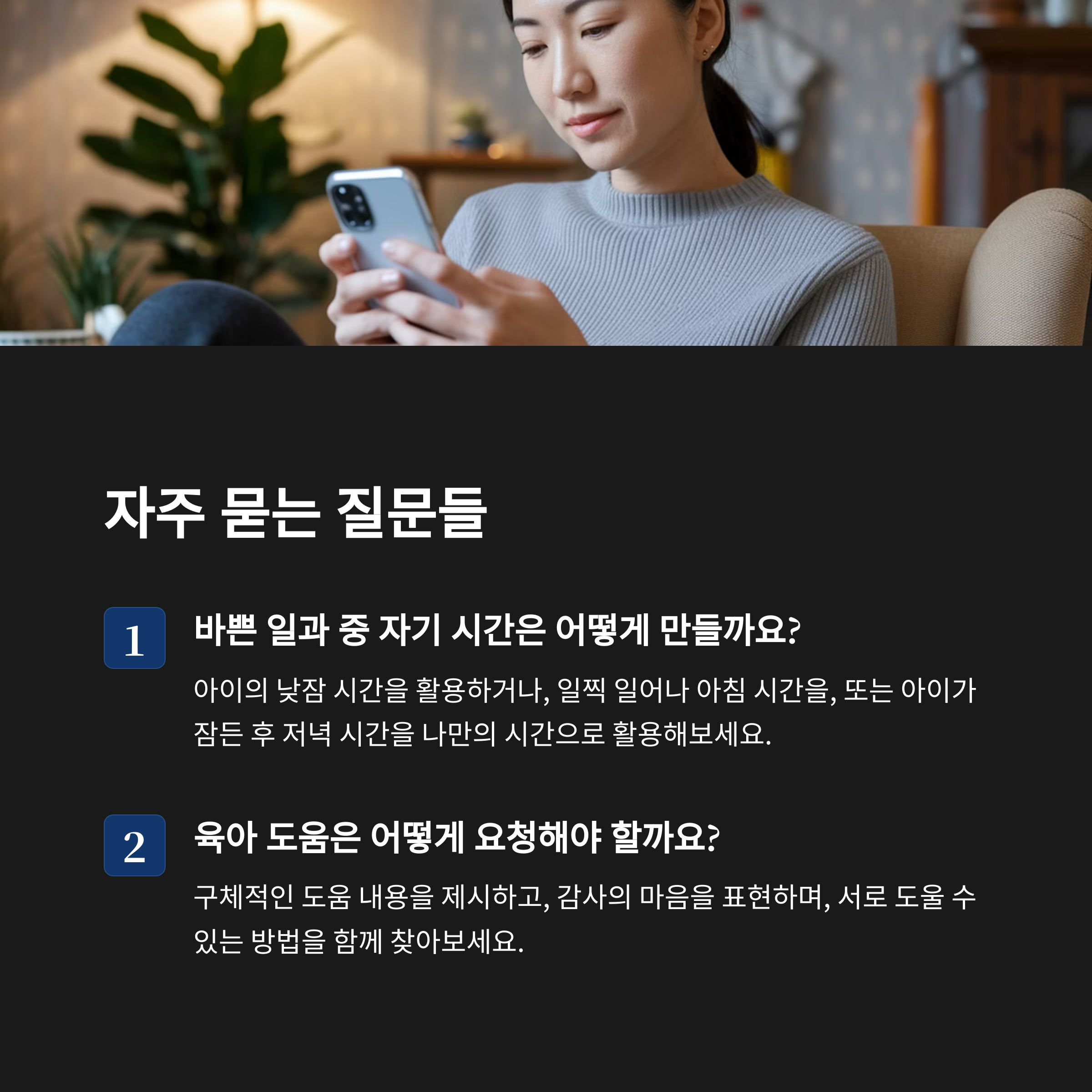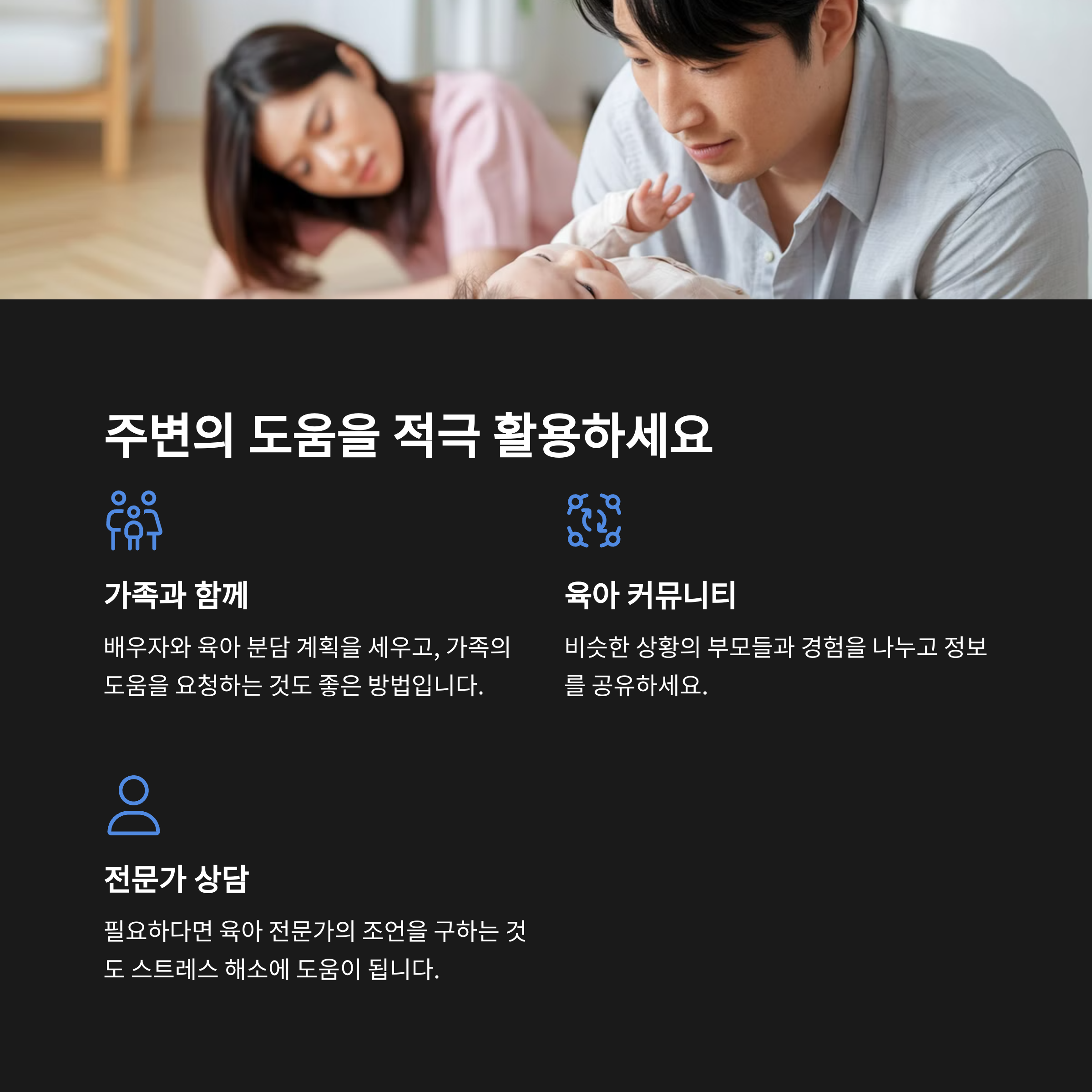 | 주변 도움 요청 | 배우자나 가족과 육아를 나누세요. |