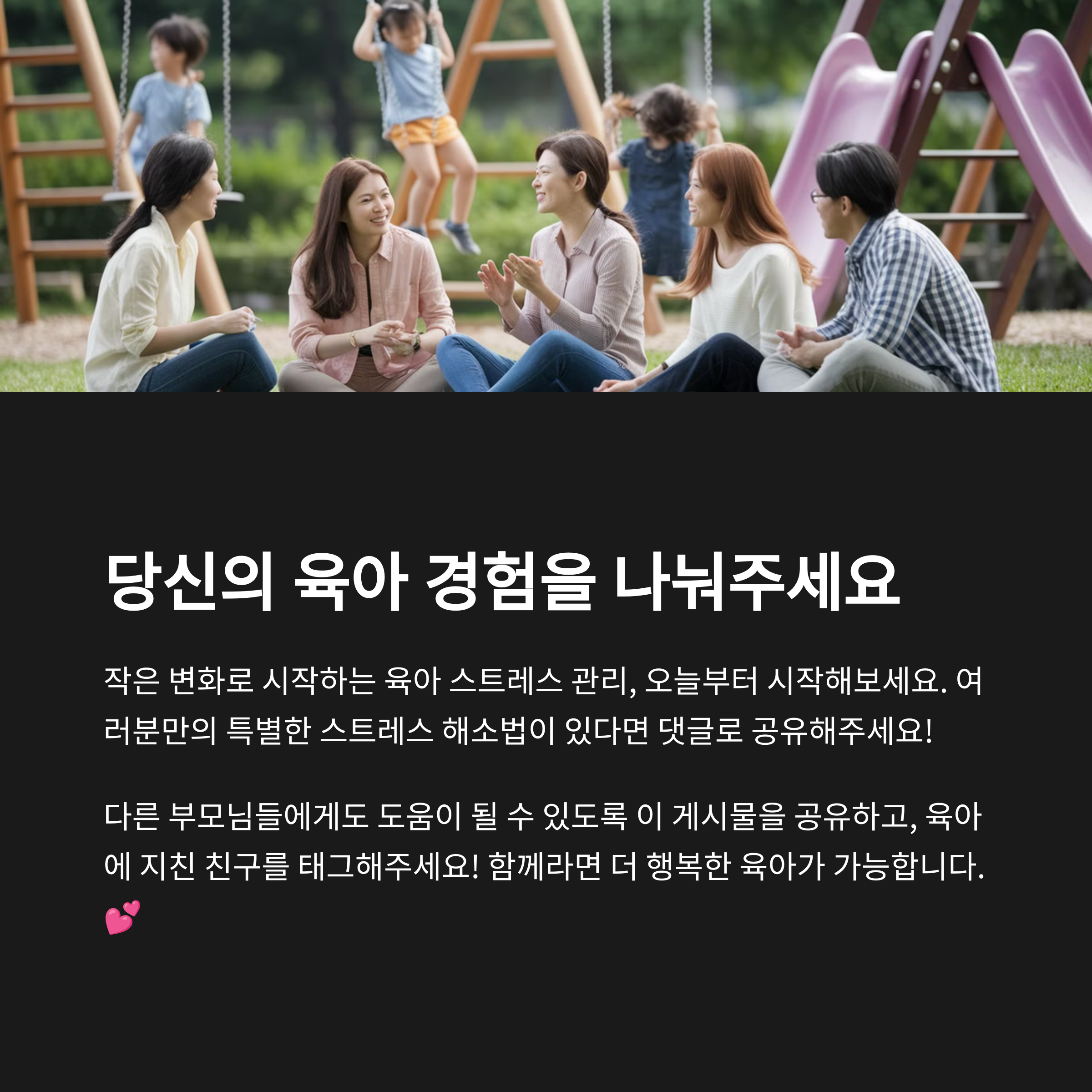 육아 스트레스를 줄이기 위해 어떤 방법을 사용하시나요? 여러분의 소중한 경험을 댓글로 남겨주세요!