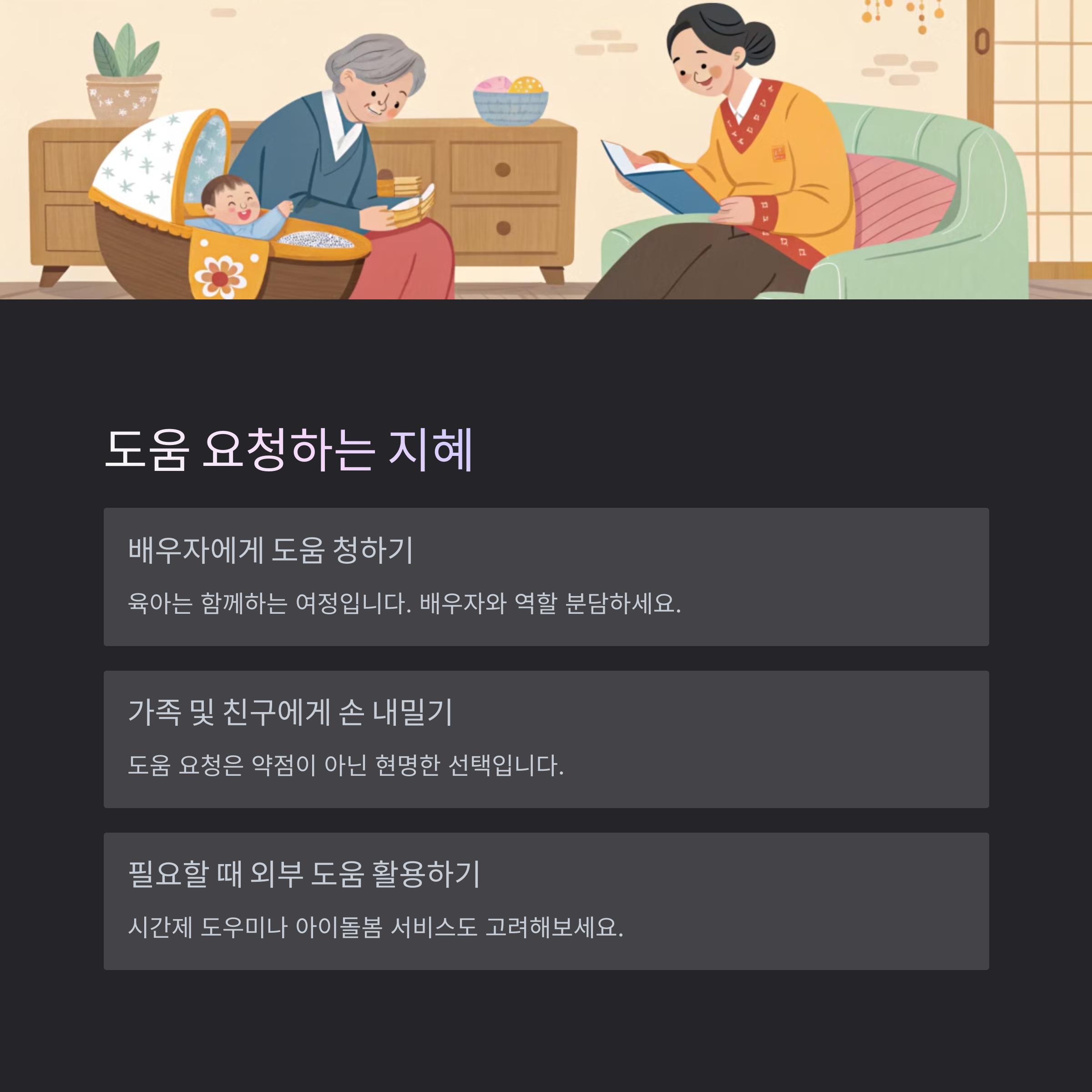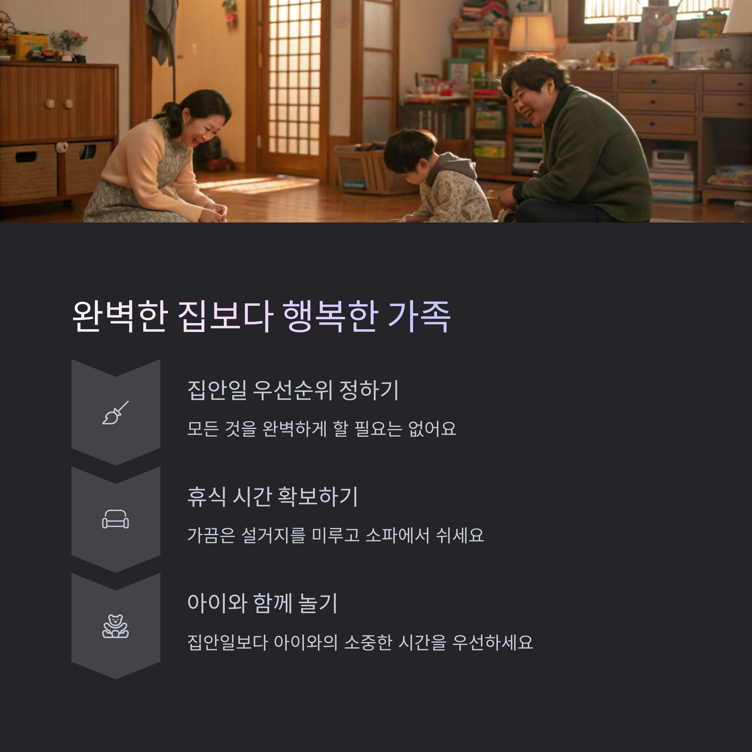 | 실패해도 괜찮다는 여유를 갖는 연습이 필요합니다. | 좋아하는 취미, 음악, 향기 활용하기도 효과적입니다. | 육아는 함께하는 것, 혼자 감당하지 않아도 됩니다. |