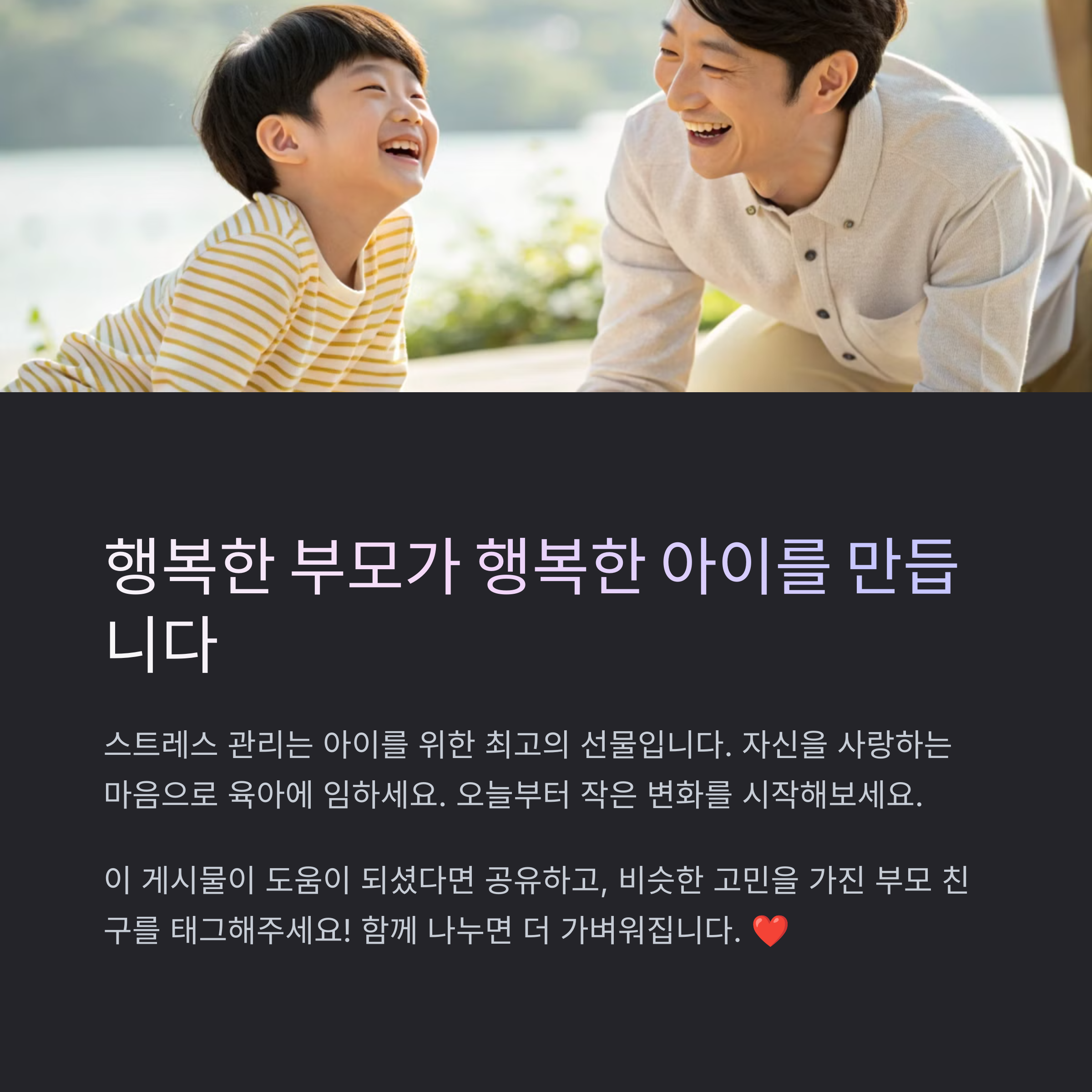 육아는 결코 혼자의 몫이 아닙니다. 나 자신을 돌보는 작은 실천이 결국 아이에게도 따뜻한 영향으로 돌아옵니다. 오늘 하루도 고생 많으셨어요.