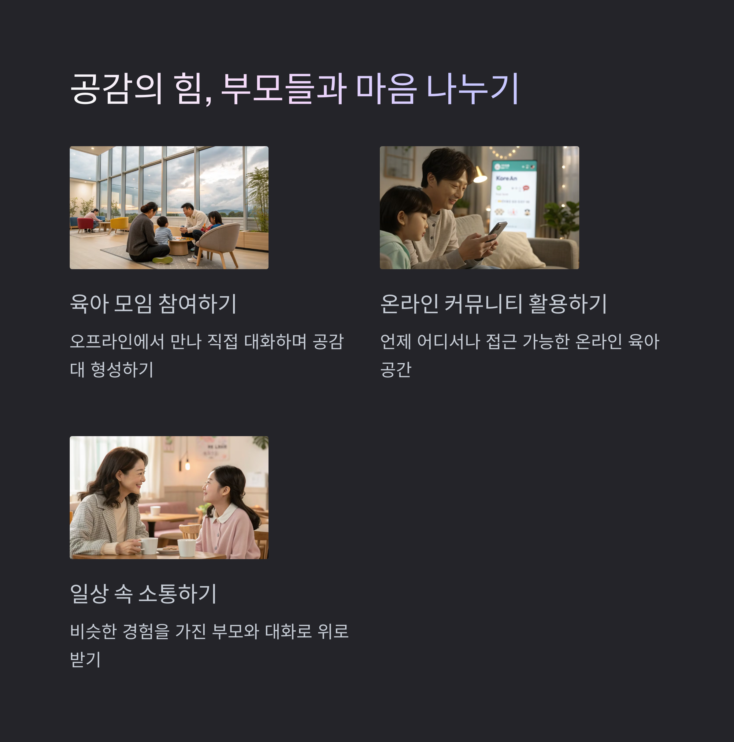| 완벽한 부모가 되려는 마음 대신 아이와의 순간에 집중합니다. | 하루 10분의 짧은 휴식이 정서적 안정에 큰 도움이 됩니다. | 배우자, 가족, 전문가 등과 함께 나누면 더 나아질 수 있습니다. |