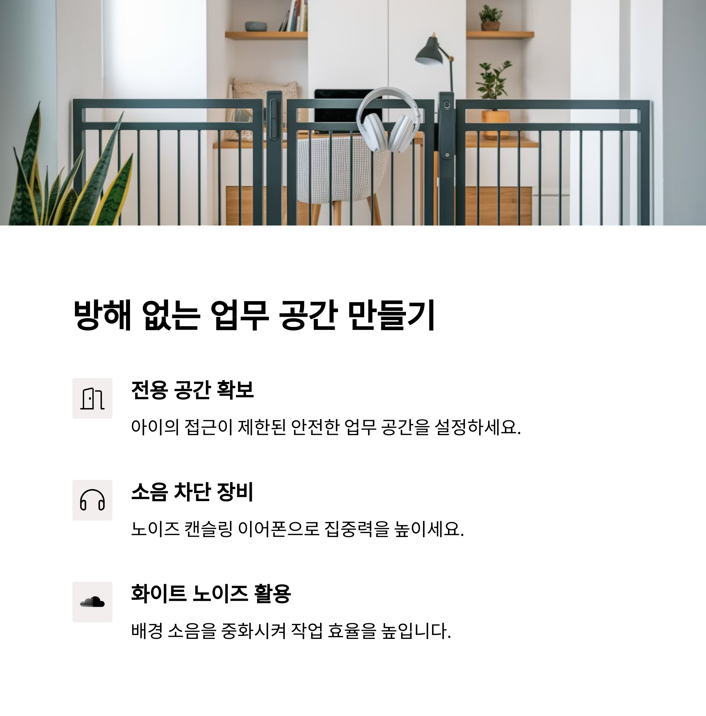 | 육아-업무 시간 나누기 | 안전한 공간, 소음 차단 준비 | 가족과 역할 나누기 |